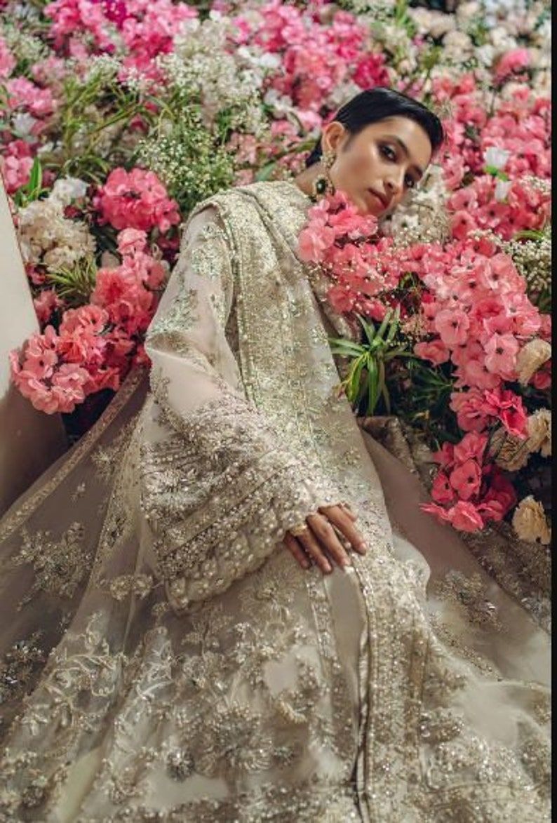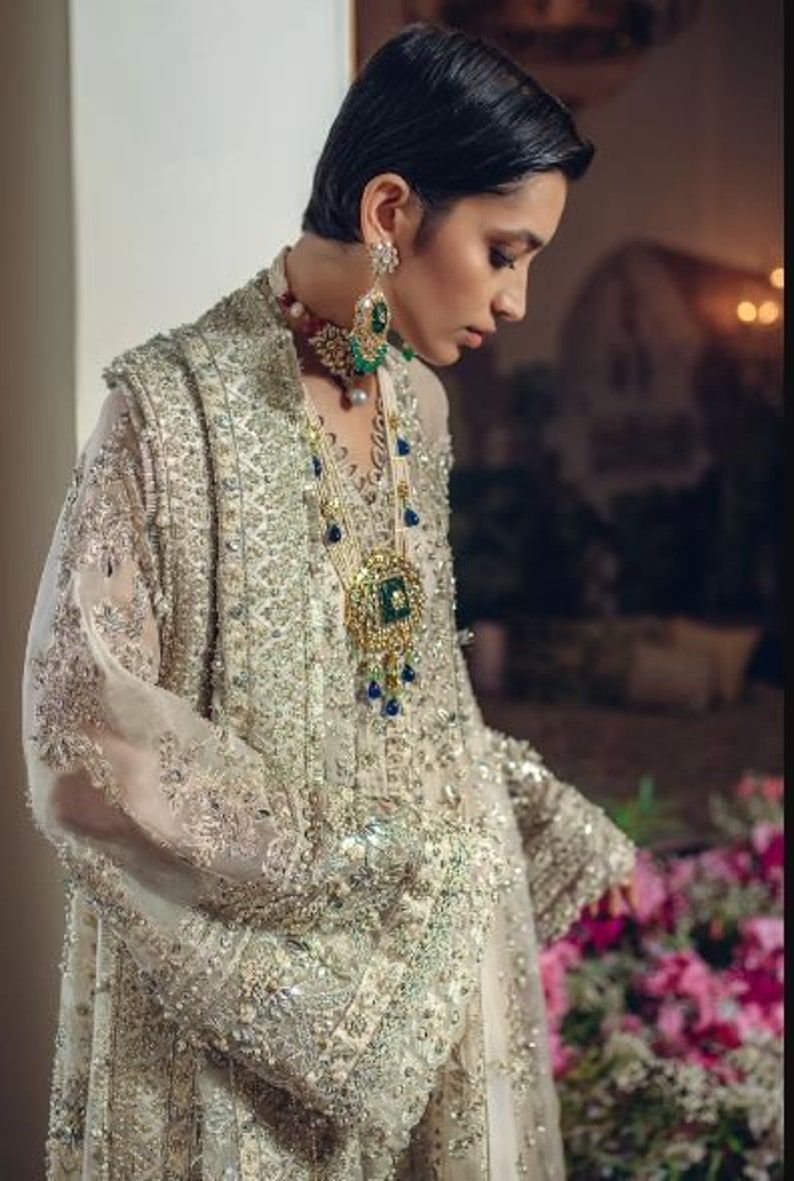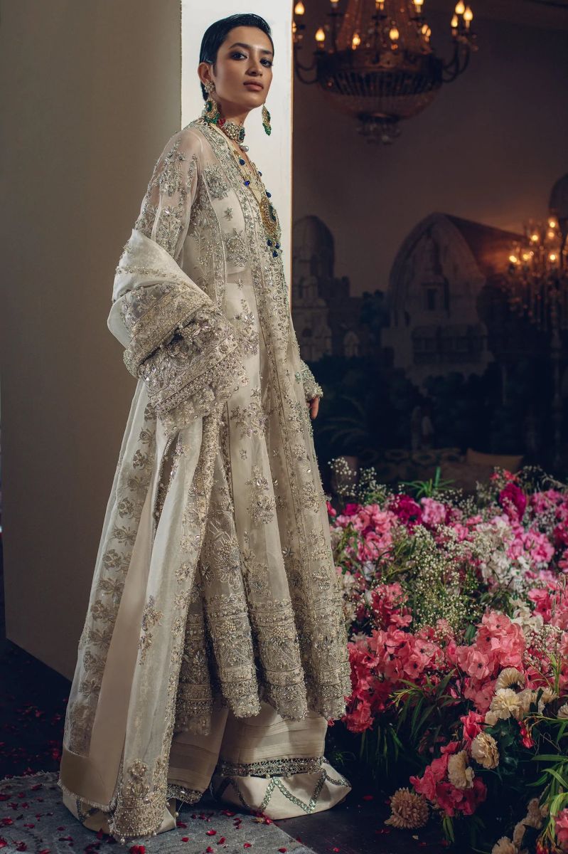 Blanche”, luxuriously laden with iridescent sequin, sparkling crystal and oyster pearls creating an ethereal impact. Paired with a diaphanous organza dupatta emblazoned with filigreed bootis, elaborately detailed borders and dramatically accented pants, this look is reminiscent.