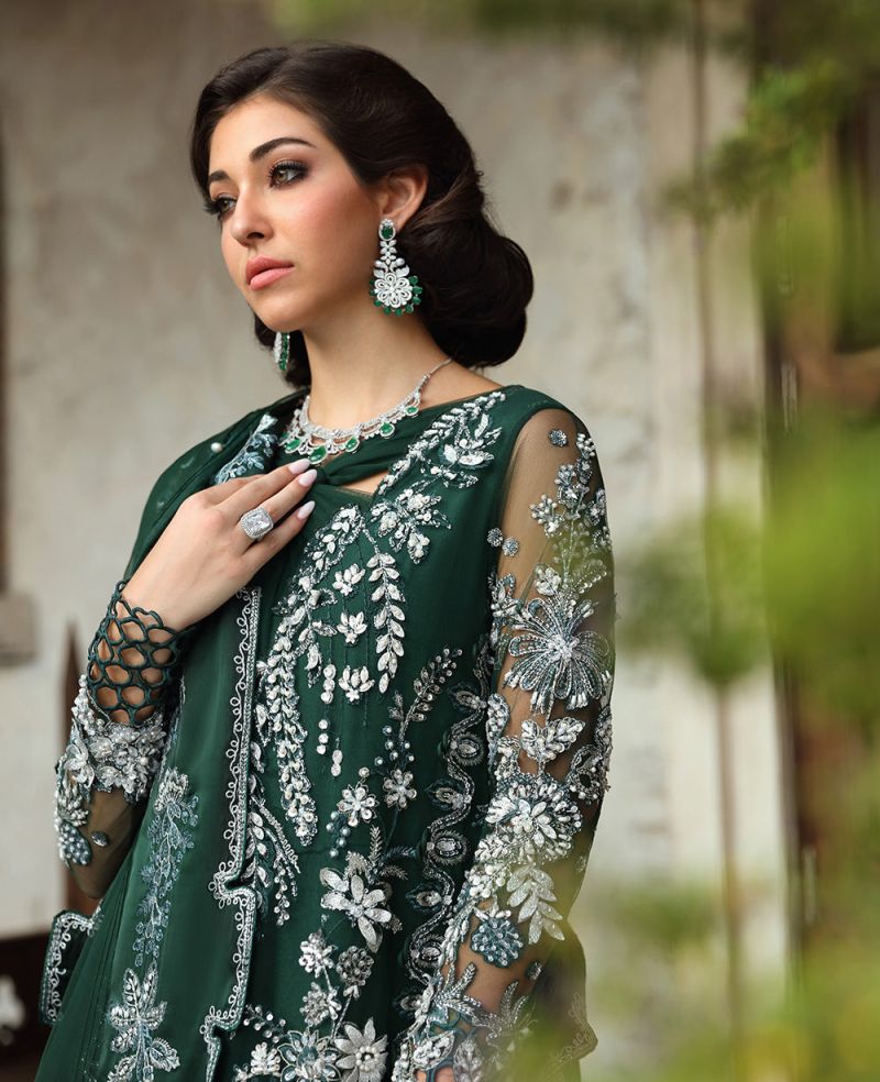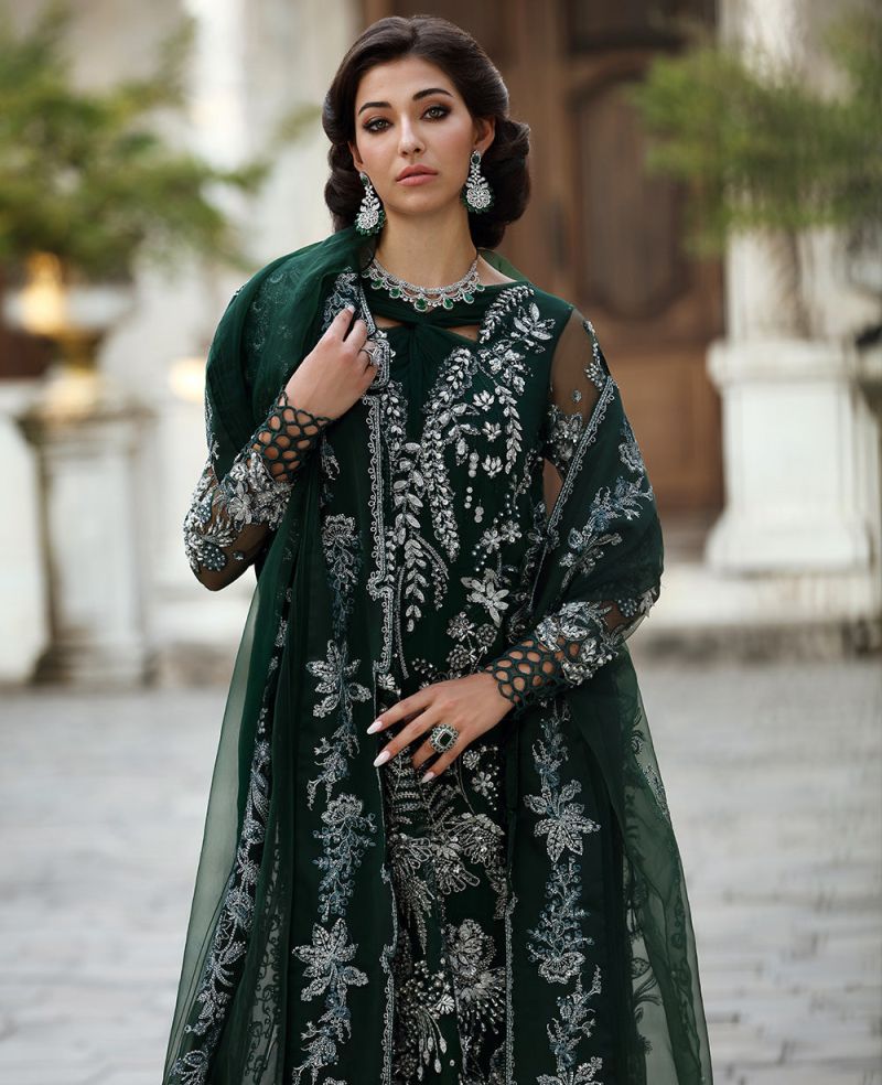 Emeraude' Emulate your inner Parisian diva with this resplendent emerald green net shirt, bedecked with intricate floral and geometric patterns meticulously incorporated on the Daman and French motifs that are expertly infused into the garment by an array of handcrafting techniques utilizing tilla, sequin, and naqshi beads, rendering it emblematic of Republic Womenswear's exceptional artistry. When combined with complementing fine raw silk trousers and a mesmerizing chevron organza dupatta in shades of green and ochre, adorned with satin borders, a supreme aura of femininity and grace embodies this ensemble.