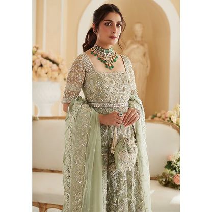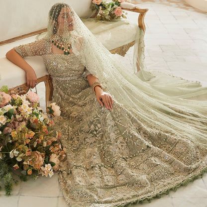 The enchanting 'Arya' rendered in ethereal pistachio is a vision of beauty, intricately adorned with a dazzling blend of shimmering silver sequins, pearls, and sparkling stones. Twelve stunning embroidered panels come together to form a magnificent heritage peshwas with a fully embellished bodice and a bejewelled belt. The dupatta is a frosted masterpiece, sprinkled with delicate crystals, pearls, and tinsel blooms along its borders acting as an ode to the grandeur of Eastern royal regalia. This couture-like ensemble is a dream come true for collectors, exuding classic elegance and timeless charm.