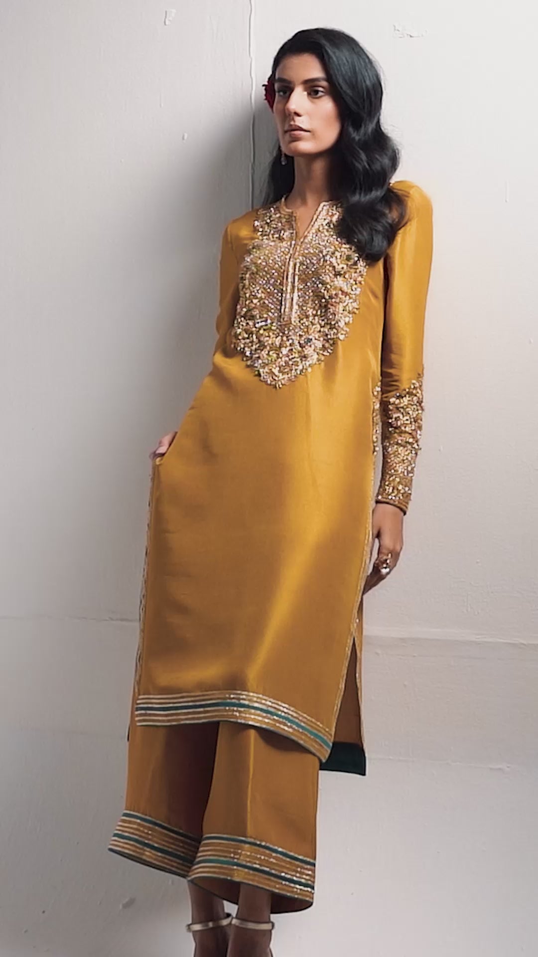 A timeless allure of organza and silk canvas, where Sage and Jade hues intertwine to create elegance. The shirt, is a testament to craftsmanship, adorned with intricate gold embroidery that mimics nature's delicate patterns. The shirt is a modern straight-cut silhouette with an elongated embellished neckline with its ethereal dupatta, a sheer masterpiece featuring delicate motifs mirroring the shirt's design. Together, this ensemble captures the essence of sophistication, seamlessly blending traditional charm with contemporary style for a captivating statement for festivities