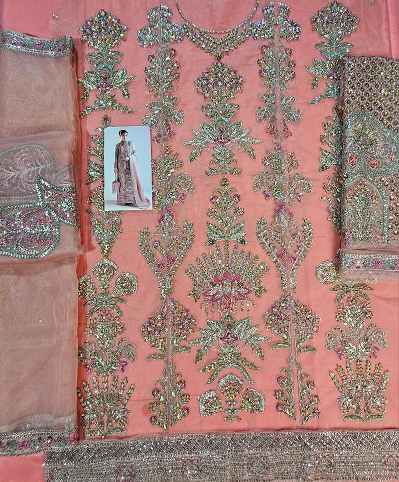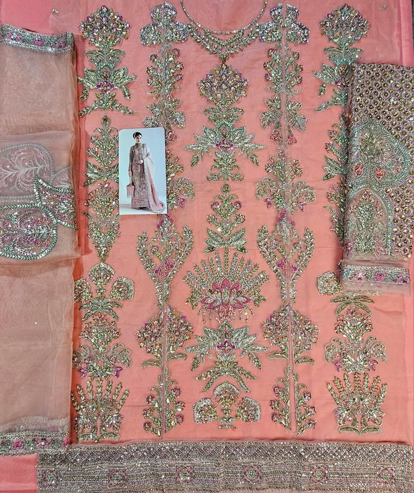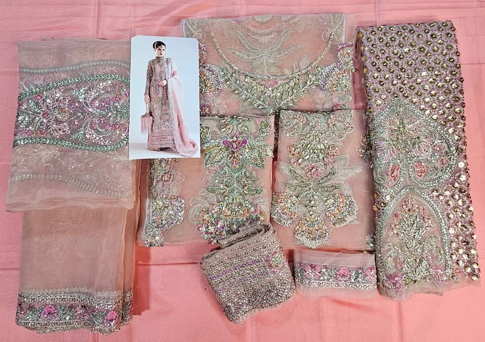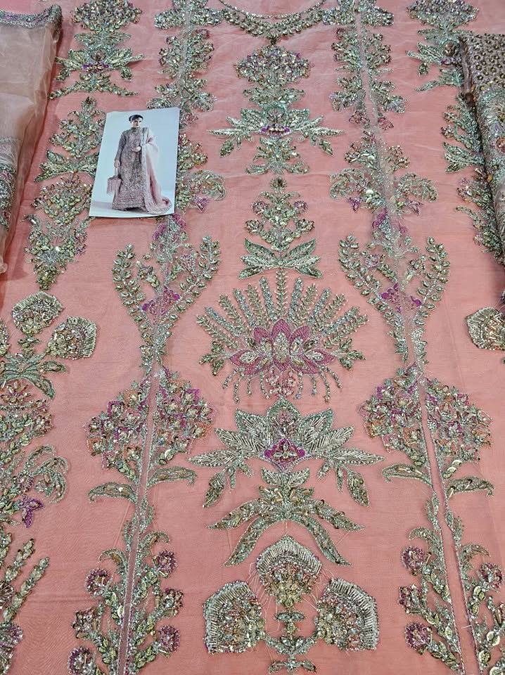 This regal outfit rendered in a beautiful shade of Pink on an organza canvas for shirt and Raw-silk palazzo, with heavy embellished motifs along with intricate details. The timeless look is completed with an organza dupatta along with four side heavy embellished borders with 3 different corner motifs embellished with sequins, cut dana and with nakashi, dabka concluding the look marvelously.