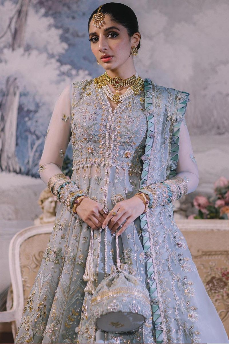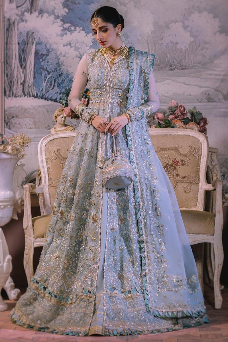 Get ready to sparkle in 'Esme' - an ethereal creation that's a work of art. Ice blue tulle comes alive with scintillating florals, and iridescent details accentuate the overall composition. Hand-placed sequins, crystals, and seed pearls add a touch of glamour to the silver and silk thread-worked blooms. The dreamy organza dupatta features intricately embroidered borders and elaborately worked pallus, making it a showstopper that's sure to captivate. With its classic, elongated silhouette, 'Esme' is a treasure that you'll cherish forever.