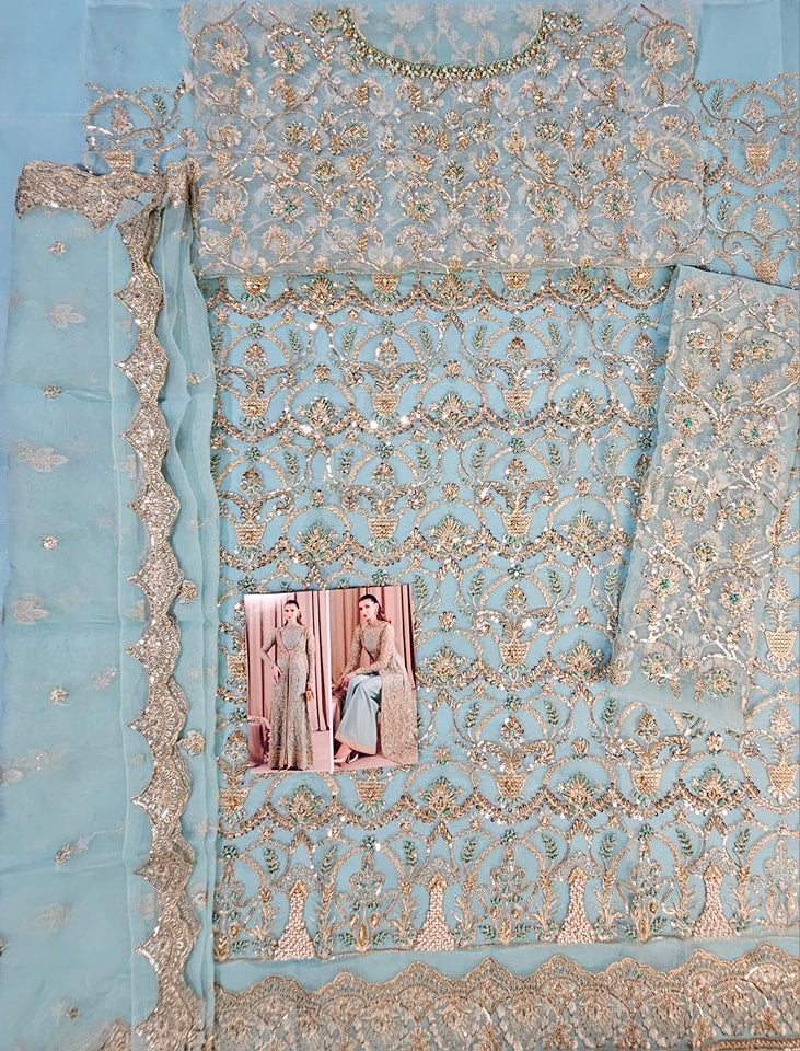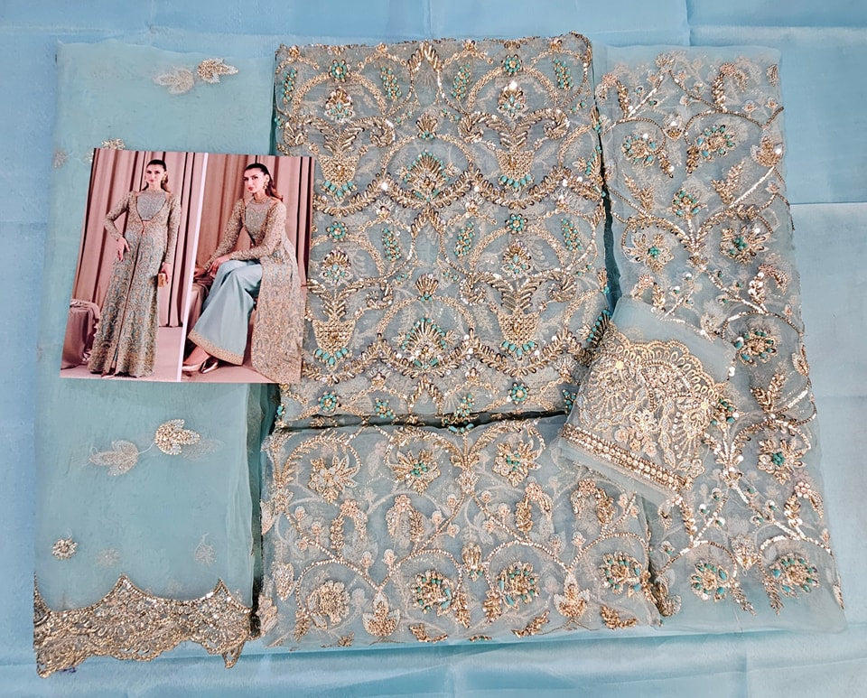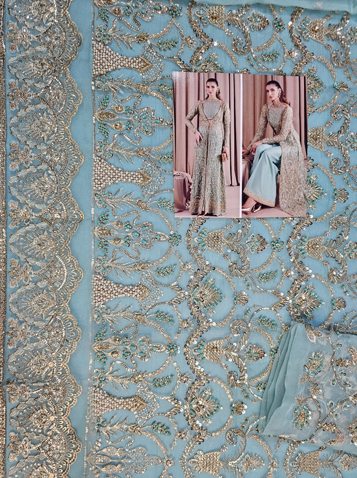 Indulge in pure sophistication with our breathtaking front-open gown, meticulously crafted from exquisite katan organza. This ensemble is more than just attire; it's an embodiment of elegance, blending glamour with unwavering confidence effortlessly. Designed to captivate every eye, it boasts opulent embroidery and exquisite embellishments, each stitch a testament to masterful craftsmanship. The distinctive embroidered bustier at its heart is a marvel of design, sculpting and accentuating the figure with grace and ease. Paired flawlessly with flared trousers adorned with embroidered borders and delicate gold lace detailing, this ensemble radiates timeless beauty and undeniable allure.