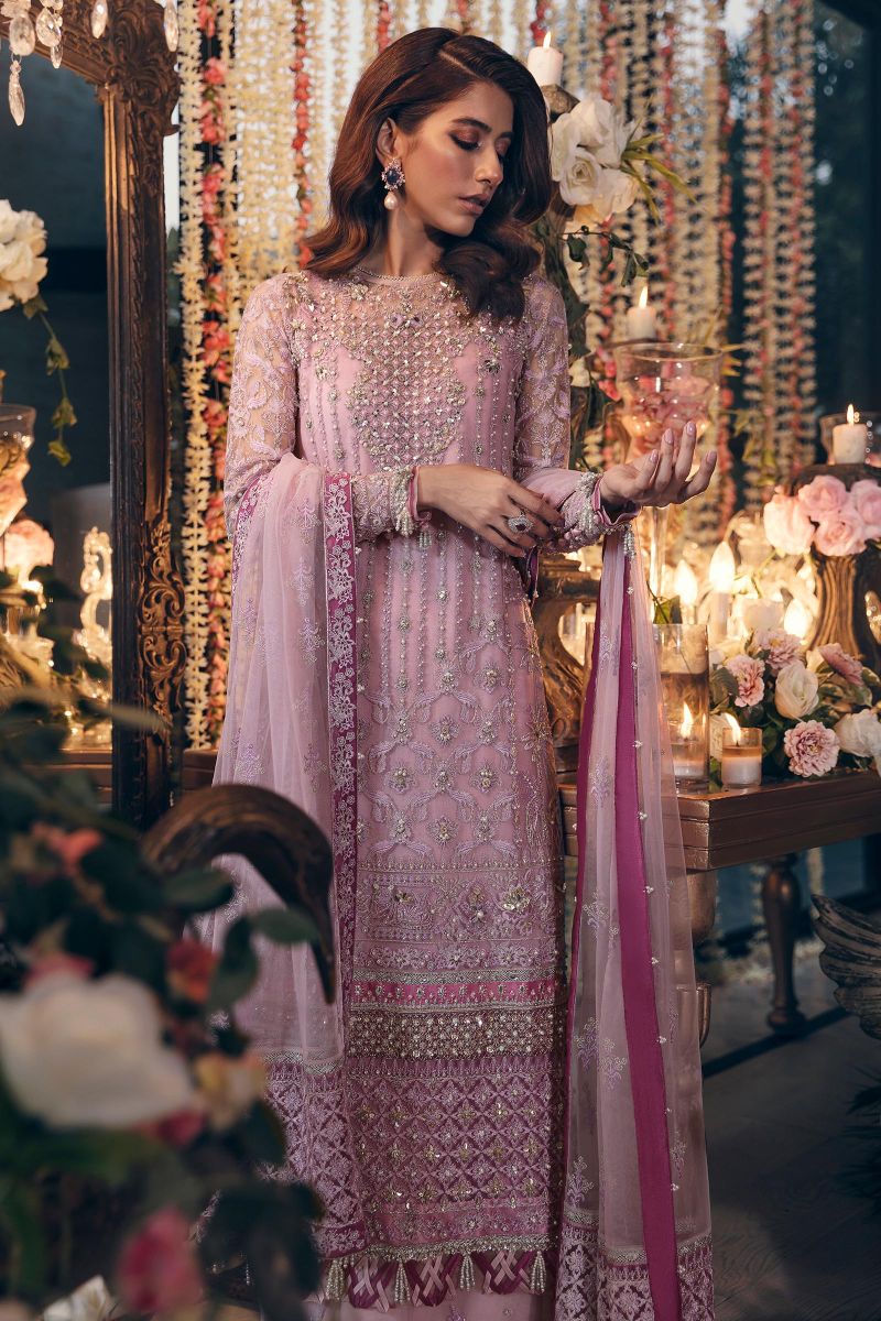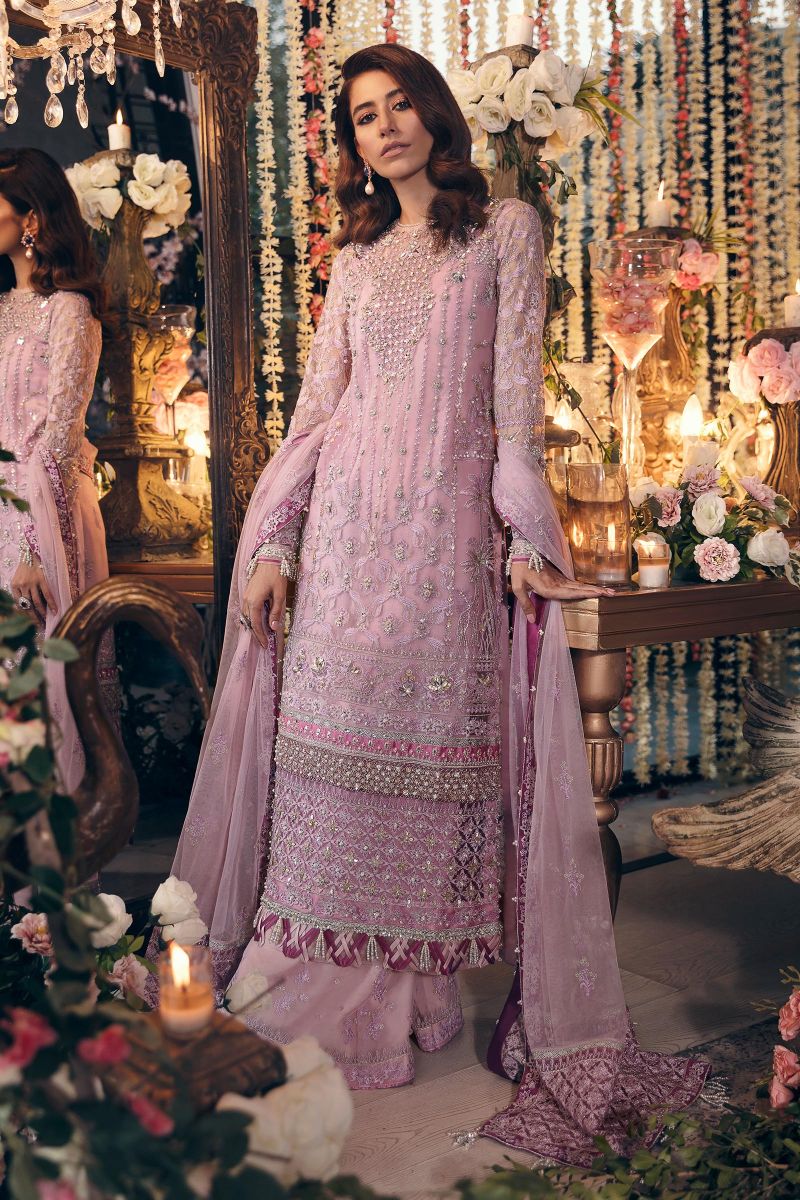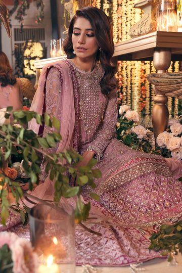 Rendered in blissful periwrinkle tones with exquisite embellishments, 'Nazanin' features shimmering thread and tilla with pearls, sitara and pops of berry thread work. Paired with tonal trousers and a colour blocked dupatta with elaborately worked borders, this feminine and flirty design is perfect for all festivities.?