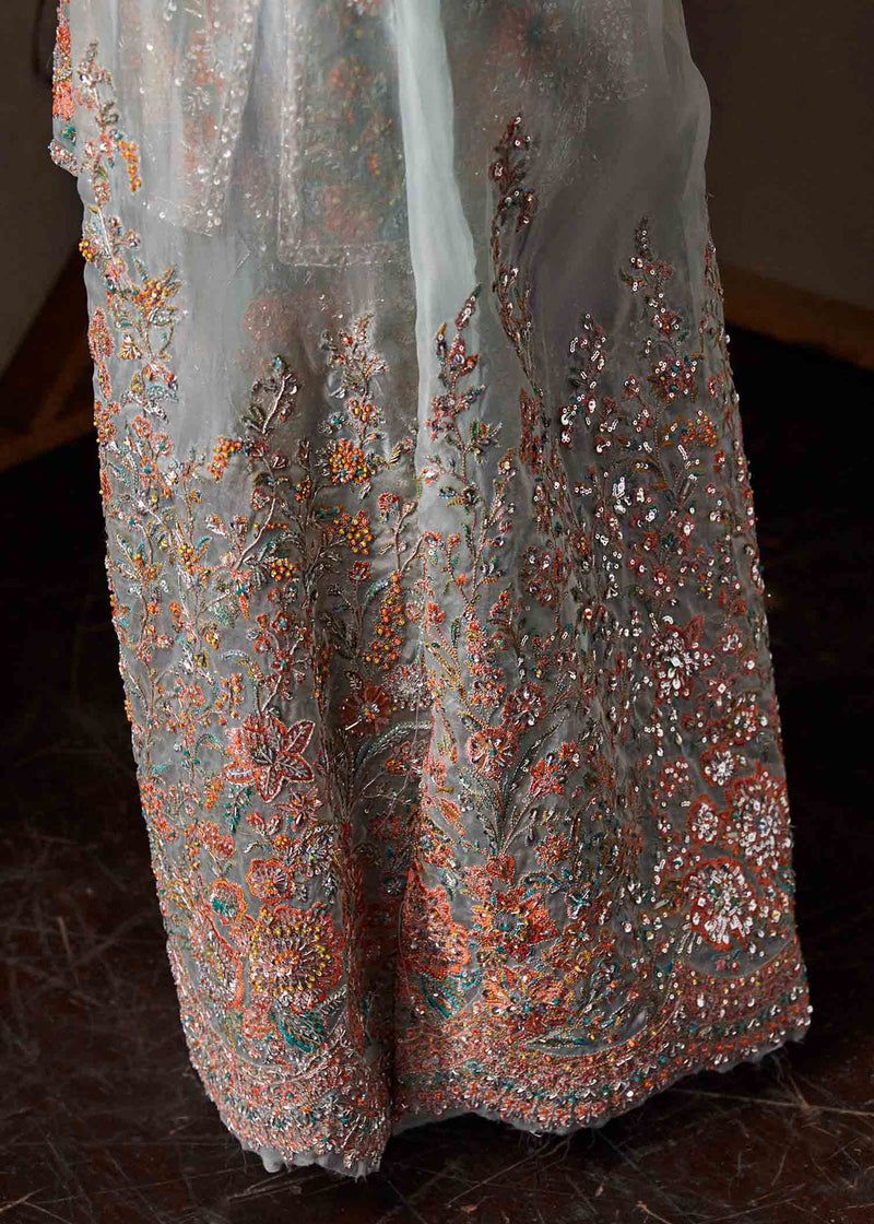 This silhouette brings a modern charm to your wardrobes with its spectrum of color blends. It features heavy embroidered trouser with intricate embelishment, paired with short length floral embroidered shirt hand embellished with sequins, naqshi, dabka and beads. To complete the look it is layered with a organza gown with flowy loose sleeves infusing this contemporary cutline.