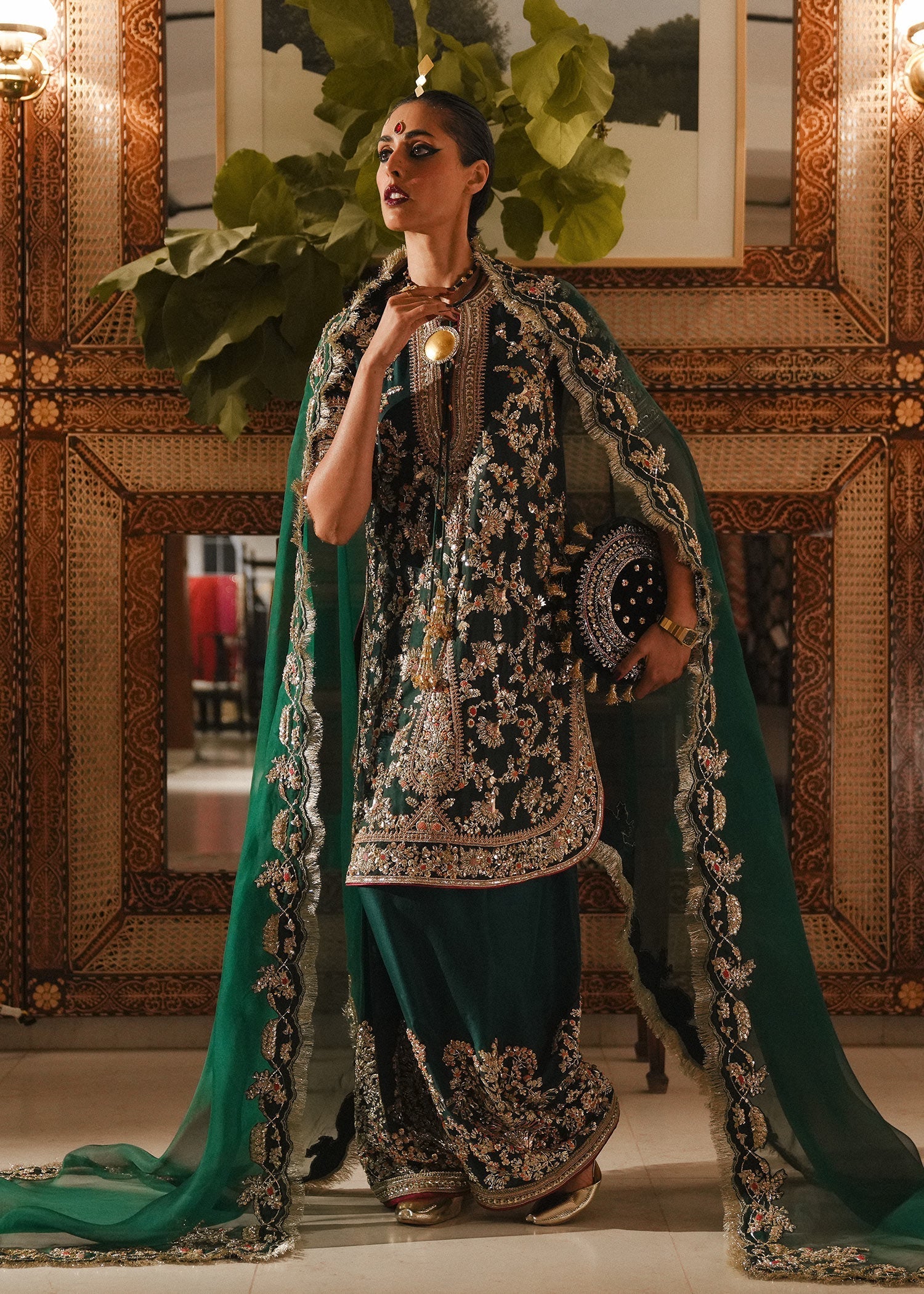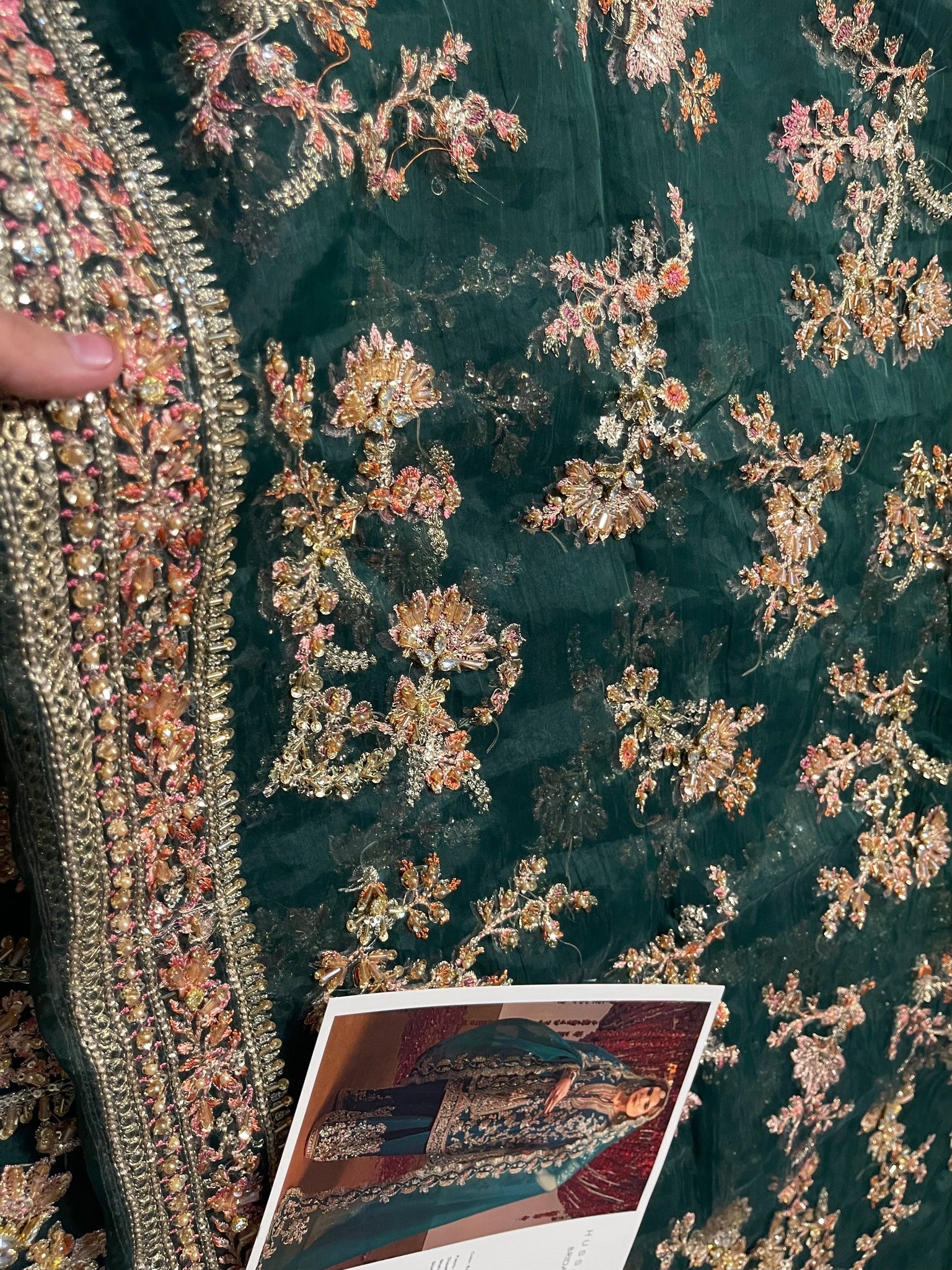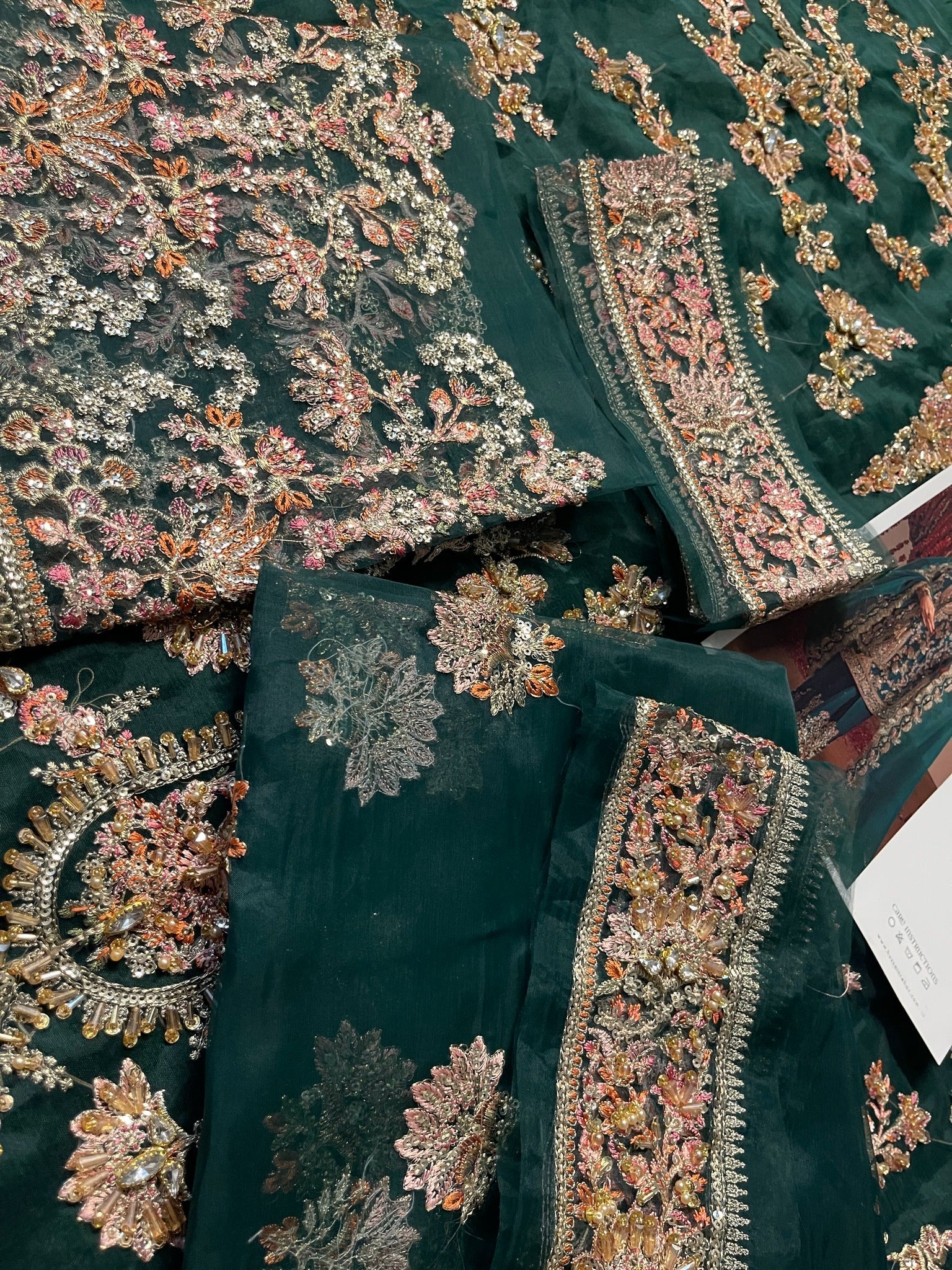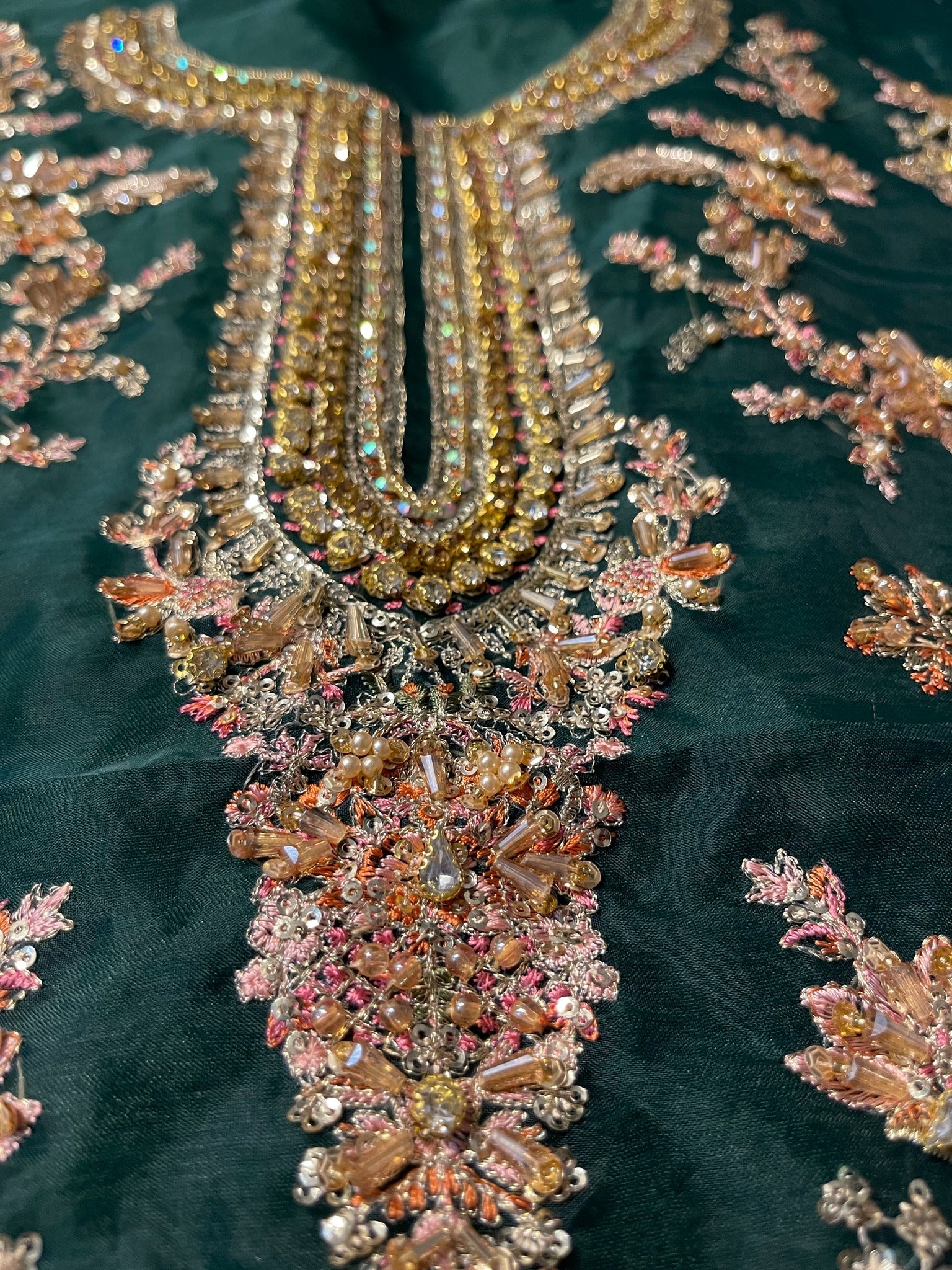 Make a bold statement in our emerald green pure raw silk shalwar and short shirt, intricately hand-embellished for a touch of luxury. Paired with a fully hand-embellished and hand-dyed pure organza dupatta, this ensemble showcases mind-blowing intricate details that captivate the eye.