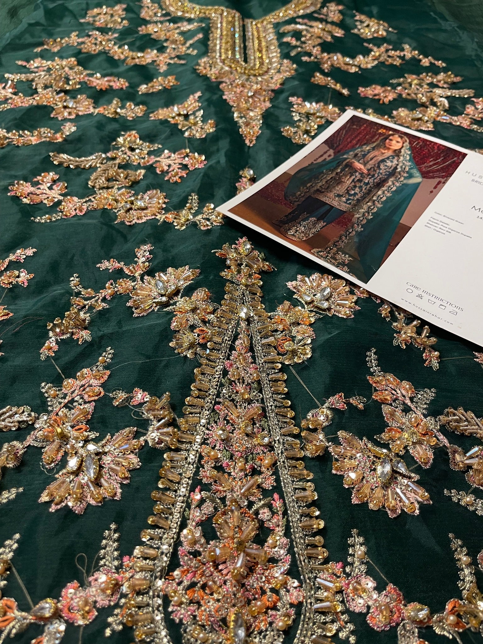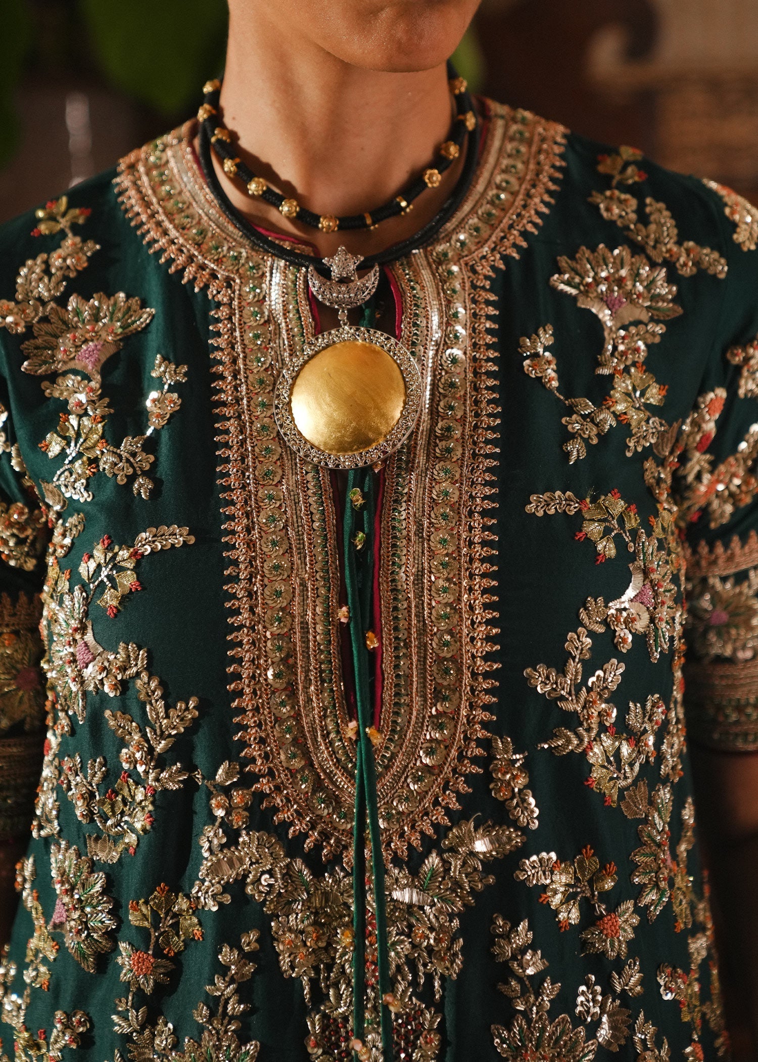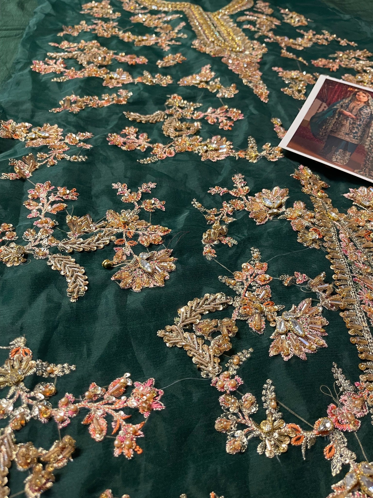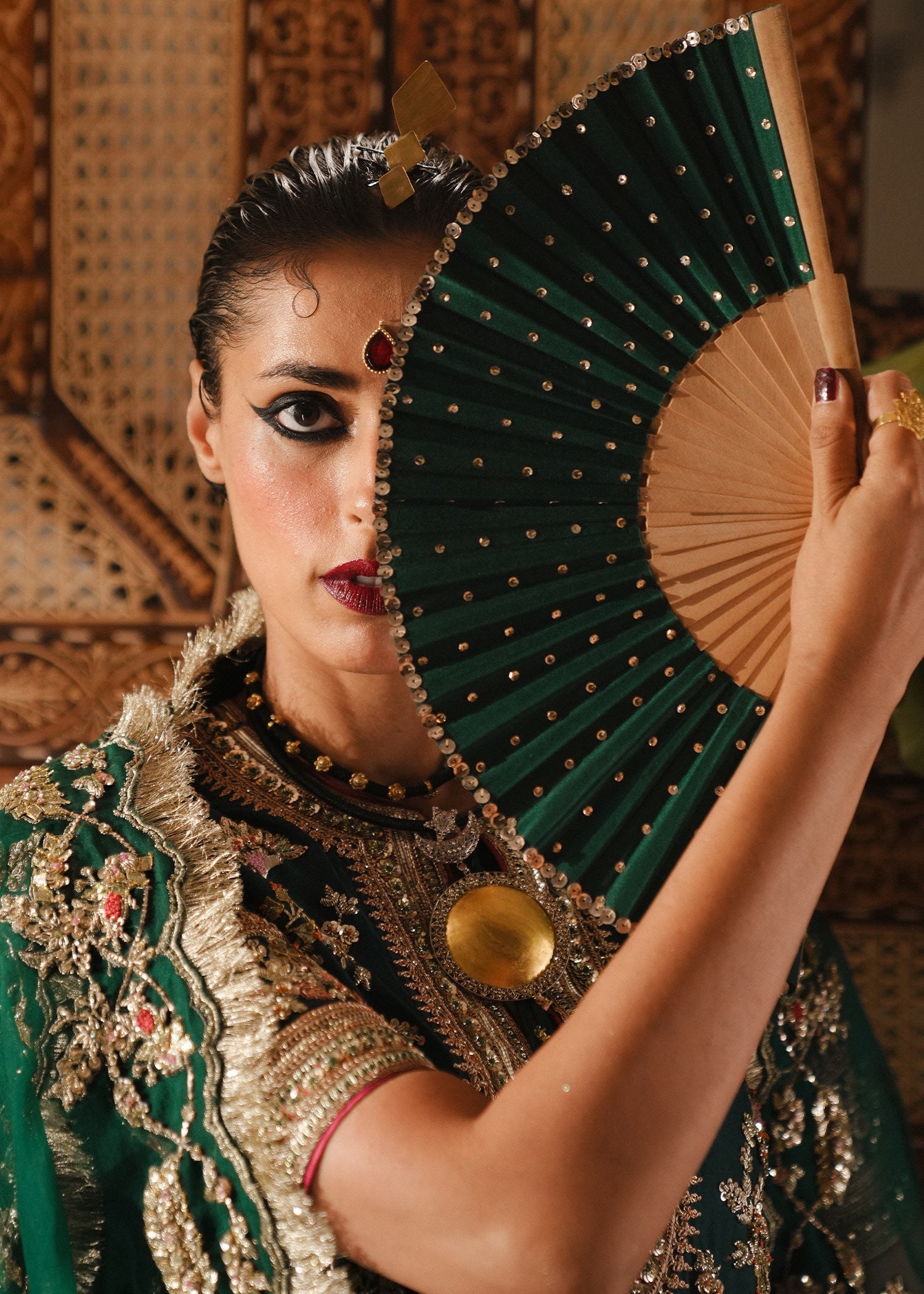 Make a bold statement in our emerald green pure raw silk shalwar and short shirt, intricately hand-embellished for a touch of luxury. Paired with a fully hand-embellished and hand-dyed pure organza dupatta, this ensemble showcases mind-blowing intricate details that captivate the eye.