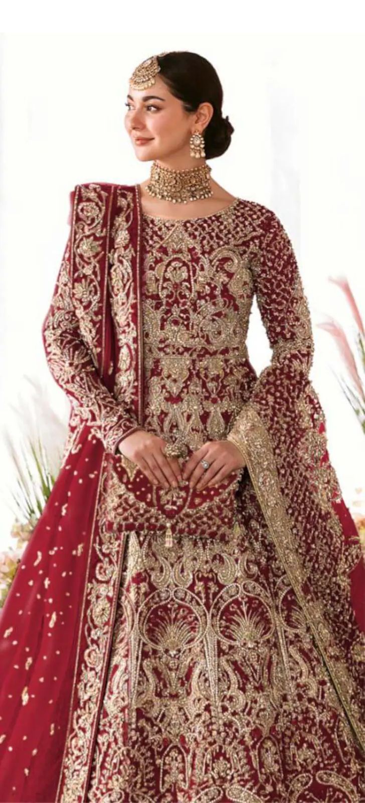 “Minha” is all about delicacy personified on a nude colored net pishwas, which exhibits heavenly embellished geometric and floral patterns, adorned with rich, magnificent details. Paired with a silk lehanga, with fully embellished exquisite border along with delicately paired with organza dupatta with four sided embellished border and extended pallu and booti spray. Moreover, a beautiful light champagne luxe net veil with pearls spray and four-sided intricate border has been added to give a goddess look to the outfit..