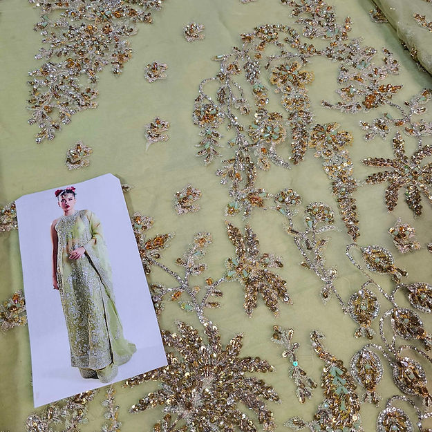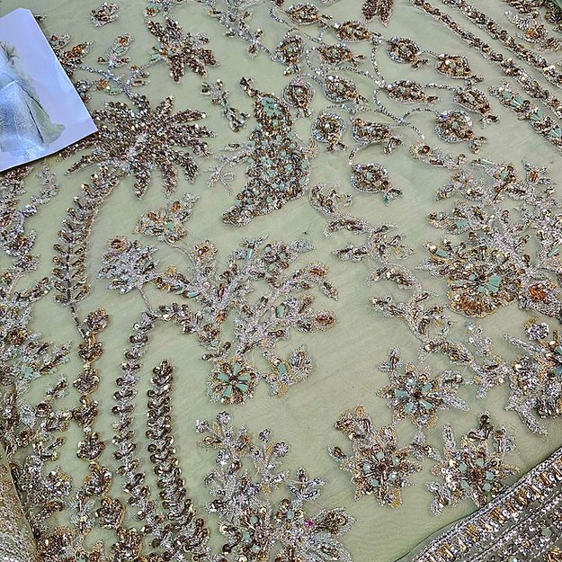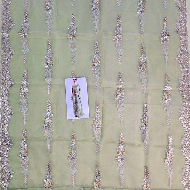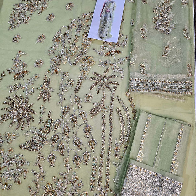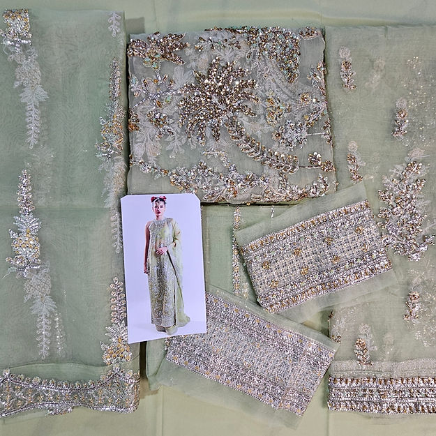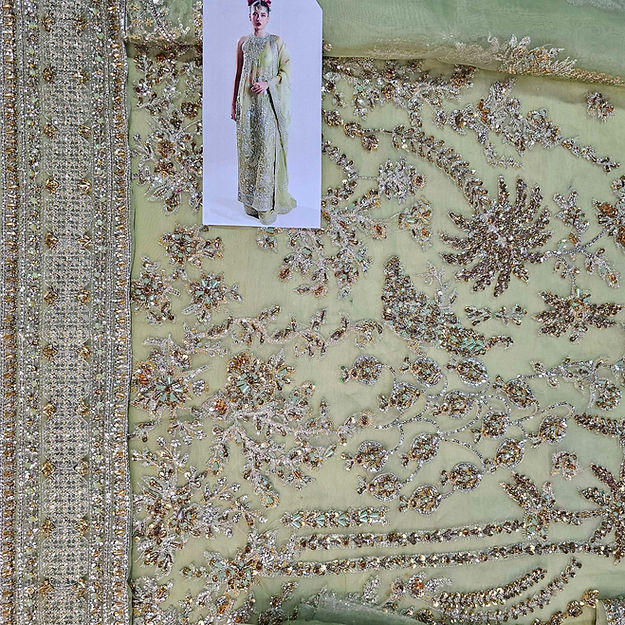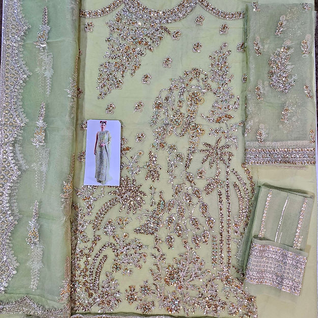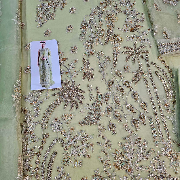 A classic nude organza short shirt crafted with exceptionally intricate embellishment of handwork pairing with organza embellished sharara with crushed medium silk lining. To complete the grandeur look it comes with organza dupatta with heavily embellished borders on four sides.