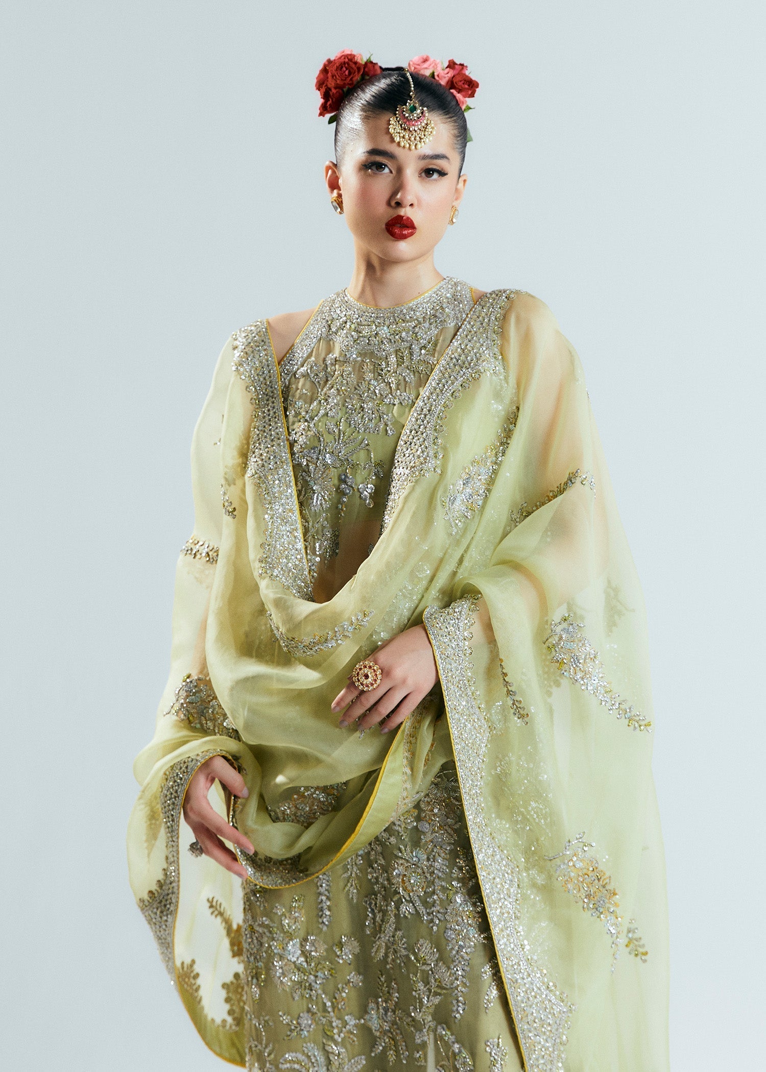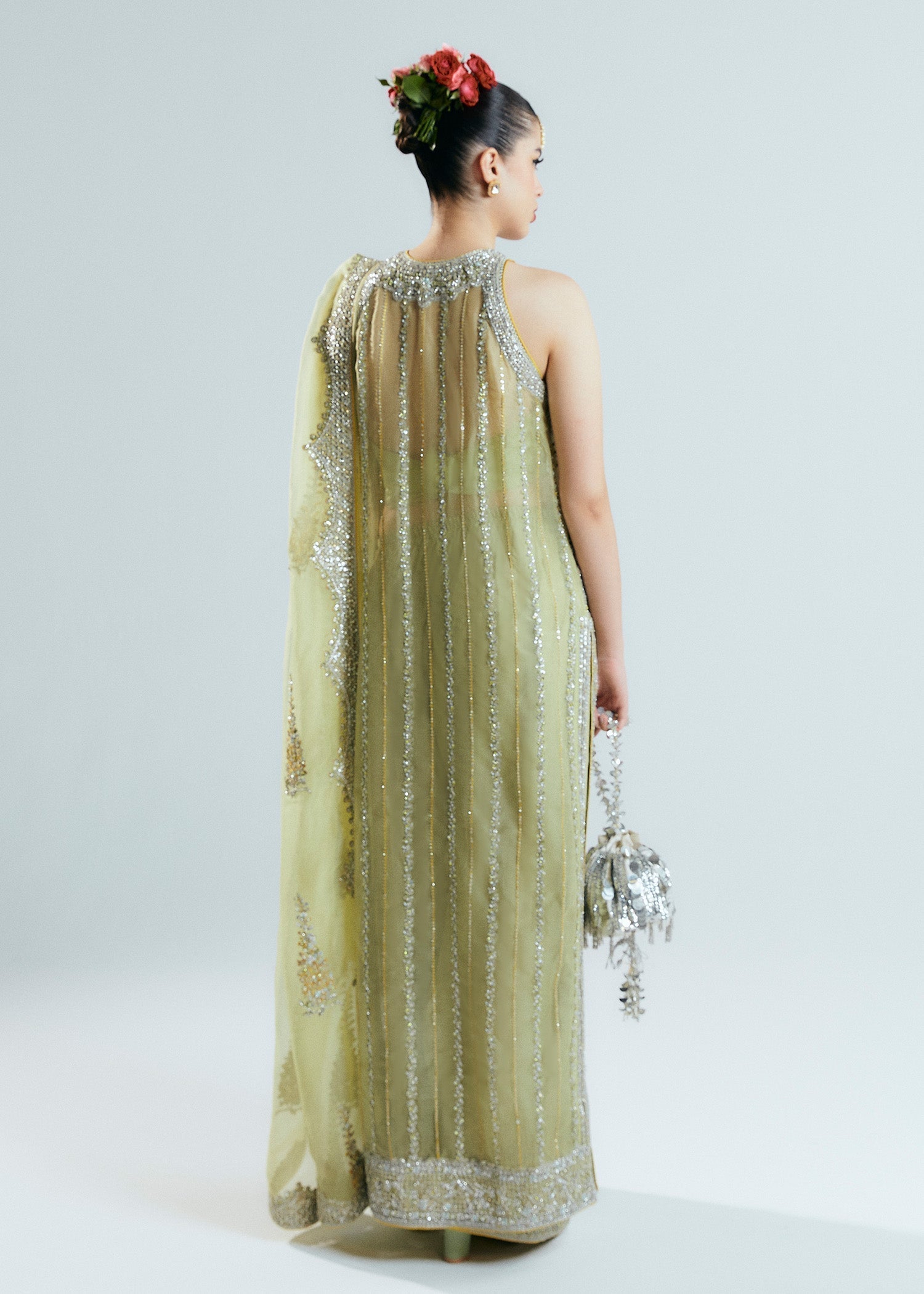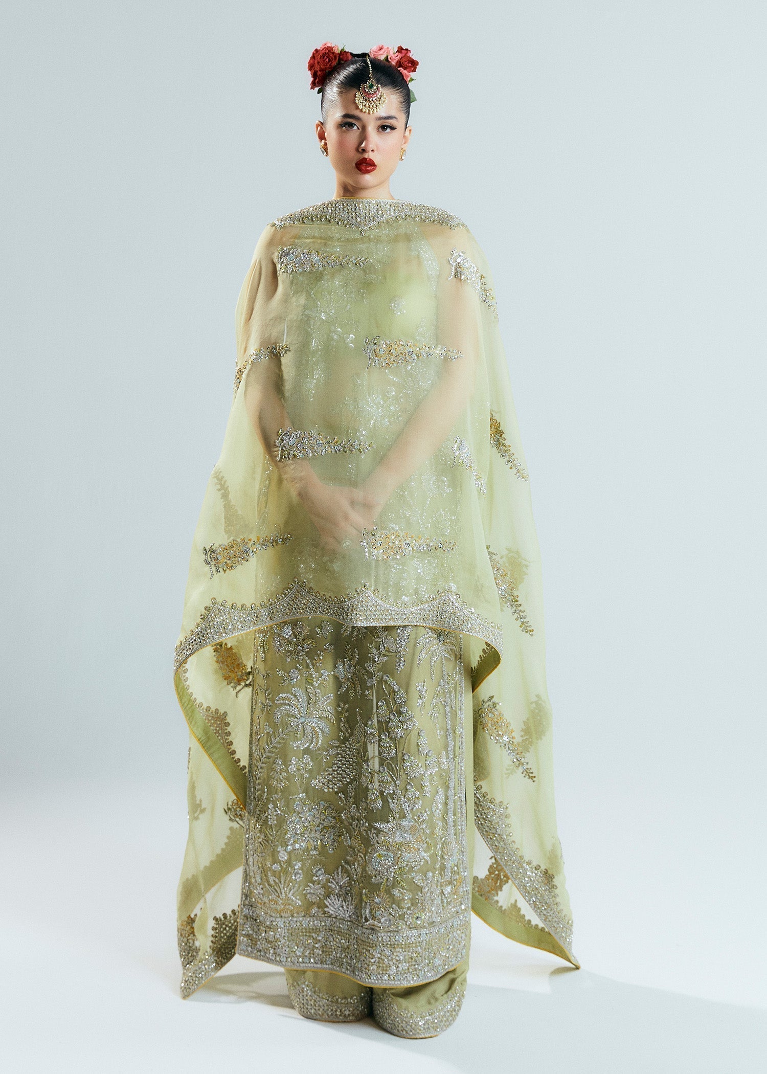 A classic nude organza short shirt crafted with exceptionally intricate embellishment of handwork pairing with organza embellished sharara with crushed medium silk lining. To complete the grandeur look it comes with organza dupatta with heavily embellished borders on four sides.