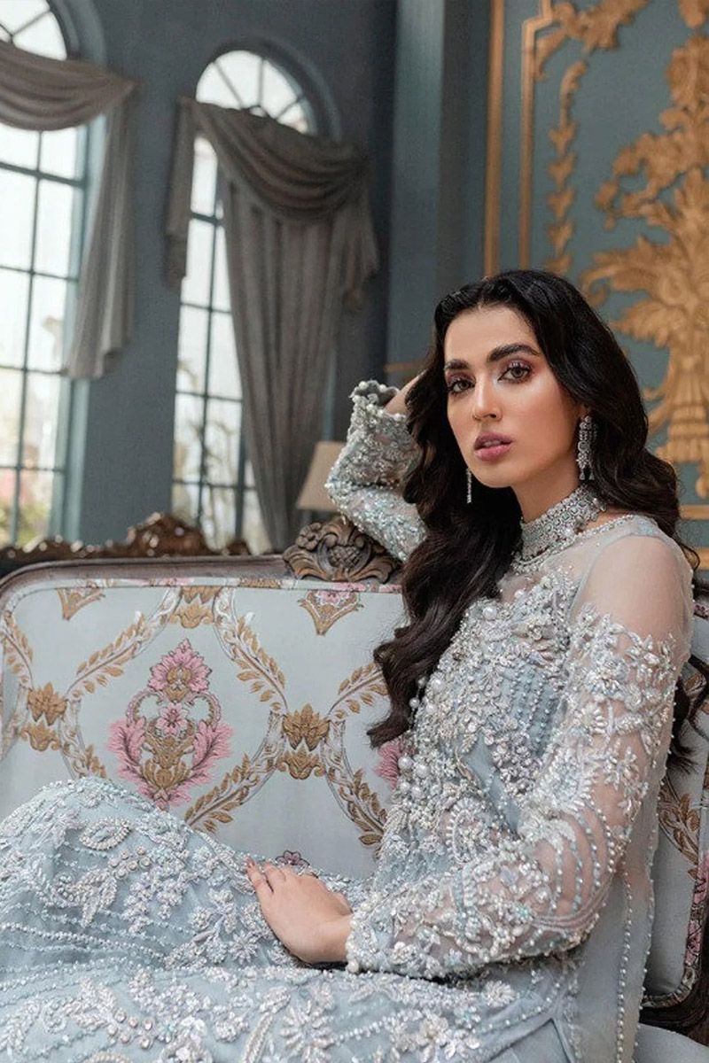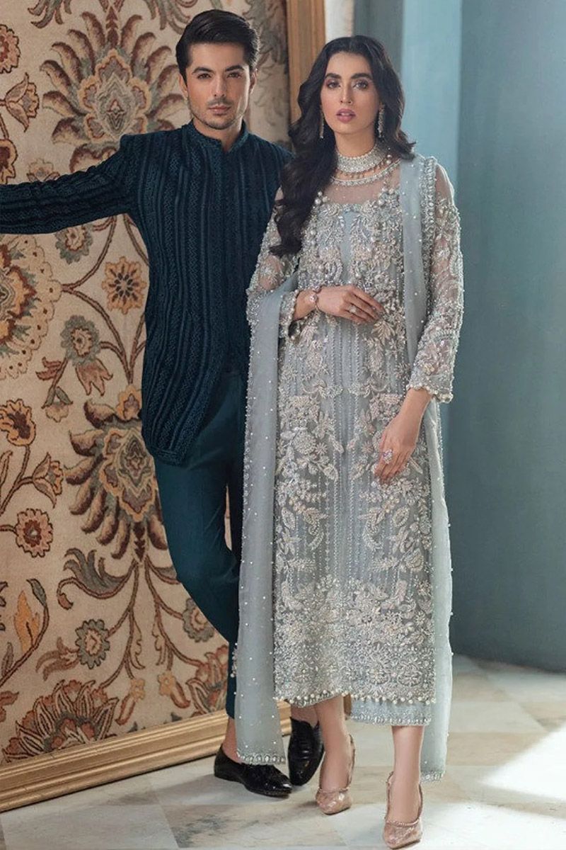 This ice blue long shirt crafted from pure silk organza is heavily ornamented with Crystal's and thread work. This luxurious outfit is finished with raw silk pants and a pearl embellished dupatta for an ethereal look.
