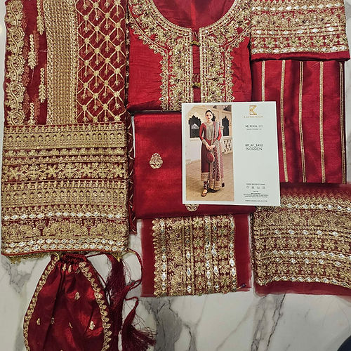 Indulge in the epitome of elegance with our exquisite long tissue silk shirt in a luxurious rich deep red tone. This opulent attire is a testament to timeless beauty, featuring intricate embroidered borders and a neckline that adds an extra layer of sophistication to its design. The meticulous craftsmanship is evident in the fine embellishments adorning the entire border of the shirt, creating a stunning visual feast. To elevate the ensemble further, the outfit is accompanied by a fully embroidered dupatta, adding a touch of glamour and completing the ensemble with finesse.