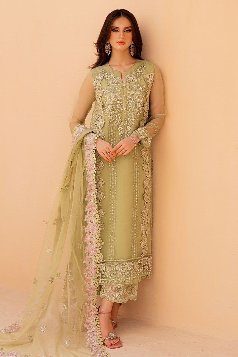 Make a statement in this green ensemble featuring elaborate hand worked and intricate bead embellishments. The rich embroidery is delicately crafted, showcasing skilled artistry and adding a touch of glamour to your ensemble