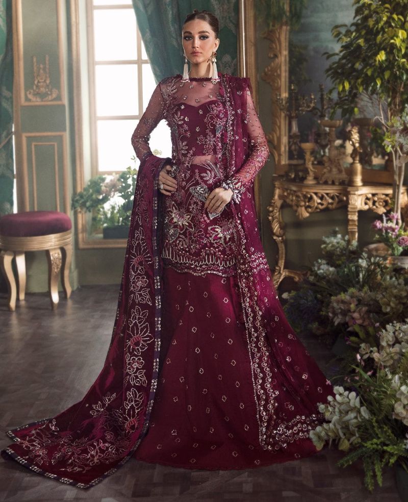 A wine color net shirt is composed in embroidered and embellished floral and leafy stalks of lilies,pensys and irises. A heavy jewelled neckline is set in pearls and crystals to make a statement with wine color satin sequins border in feathery and floral details on hem.