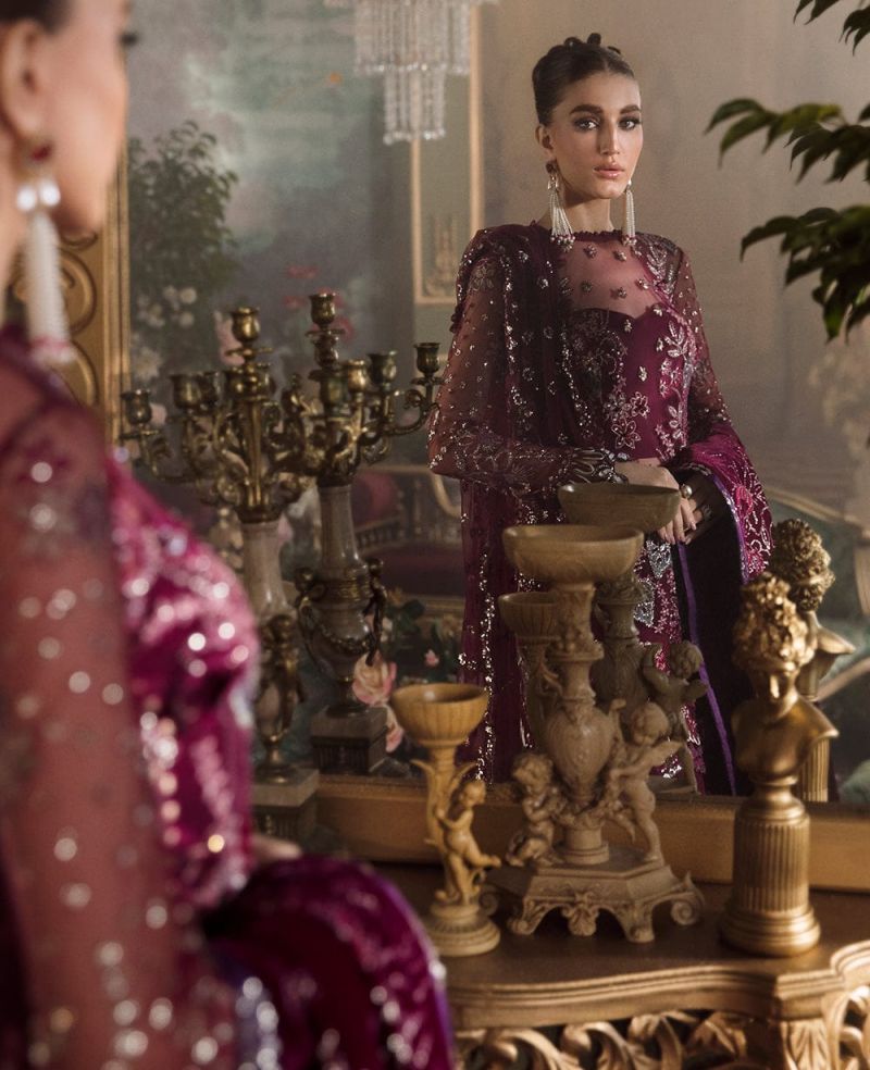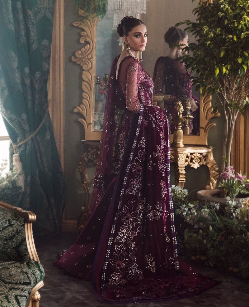 A fine plum colour velvet embroidered shawl is a cherry on top.
