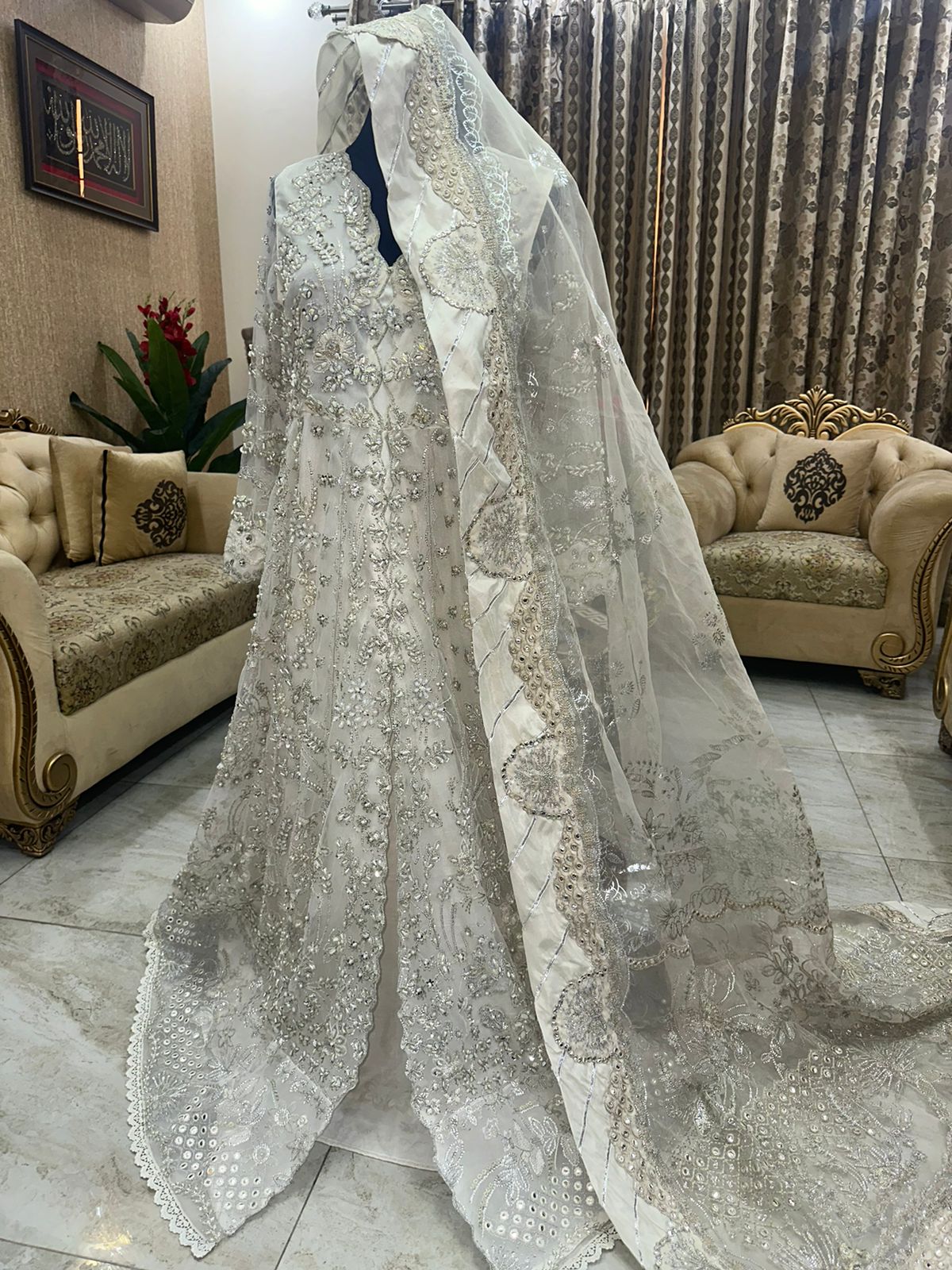 Detailed florals bloom in moonlit tendrils on the dreamy ivory organza canvas of “Un Pavot”, luxuriously laden with iridescent sequin, sparkling crystal and oyester pearls with dabka work creating an ethereal impact. Paired with an ivory organza foil print dupatta emblazoned with filigreed bootis, elaborately detailed borders and dramatically accented pants, this look is reminiscent of royal regalia and a perfect choice for any and all formal occasions.