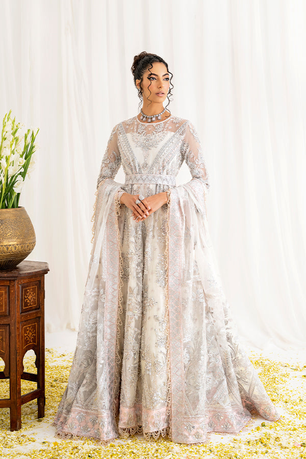 Embroidered organza front six panel kaliyan with handwork naqshi work fully