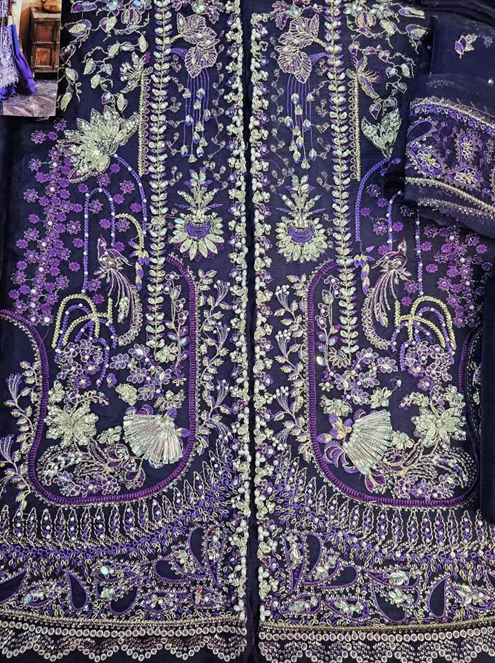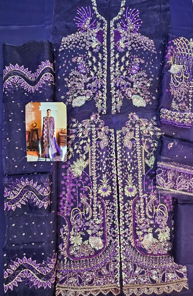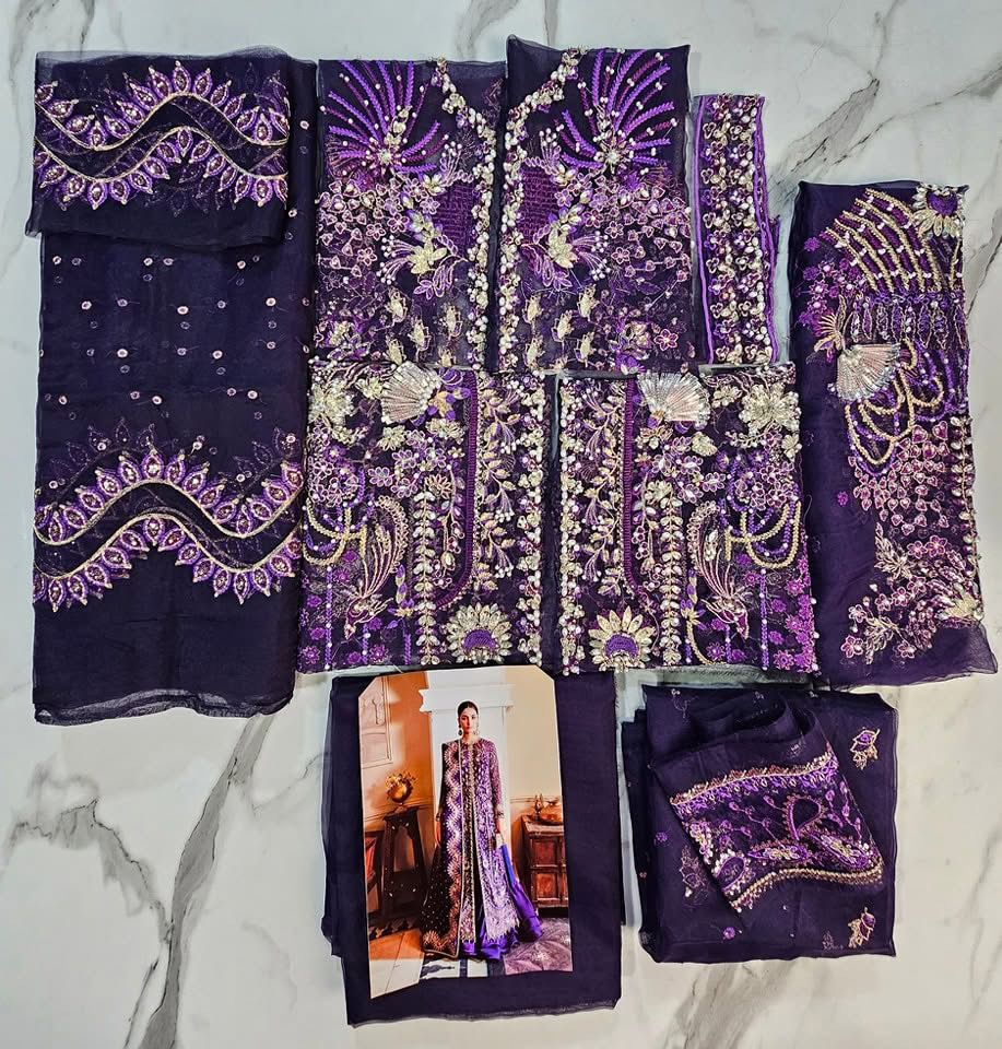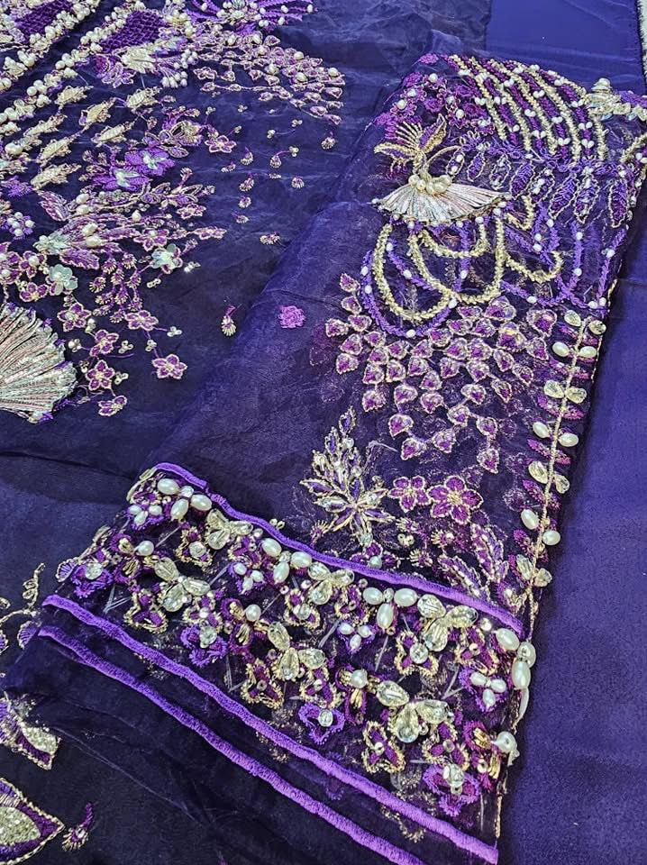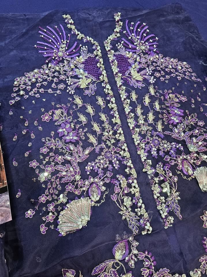 Introducing ‘MAYSA‘ the epitome of elegance and exuberance, Our Amethyst Color Organza ensemble is a harmonious blend of intricate handwork embellishment on the jacket with the side slits and daaman feature a Tribal Pattern, adding a hint of tribal allure to the dress. Complemented by graceful allure Ruffled Organza pants, This ensemble exudes opulence and distinctive style, designed to create an overall elegant look.