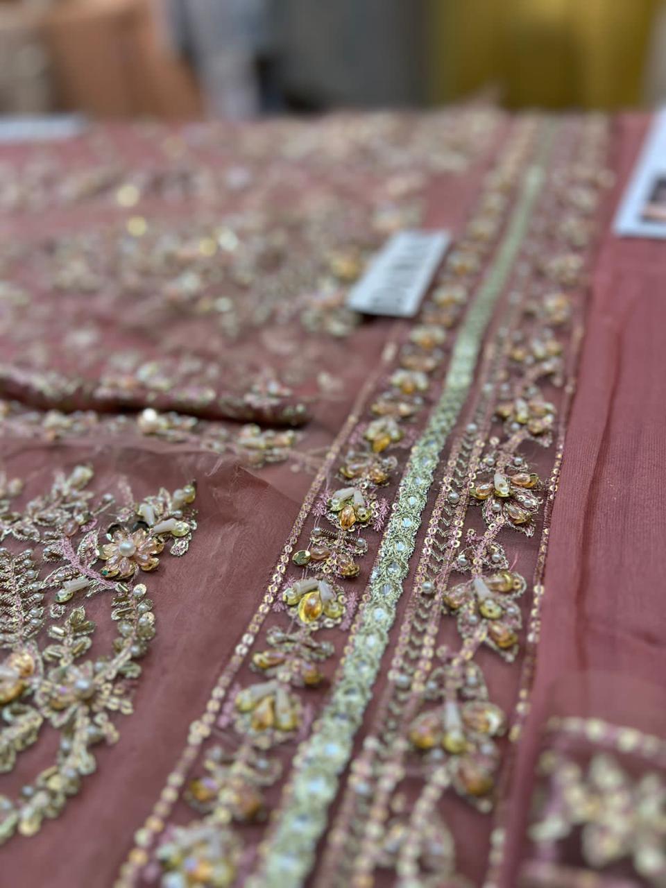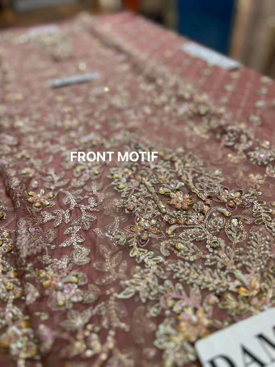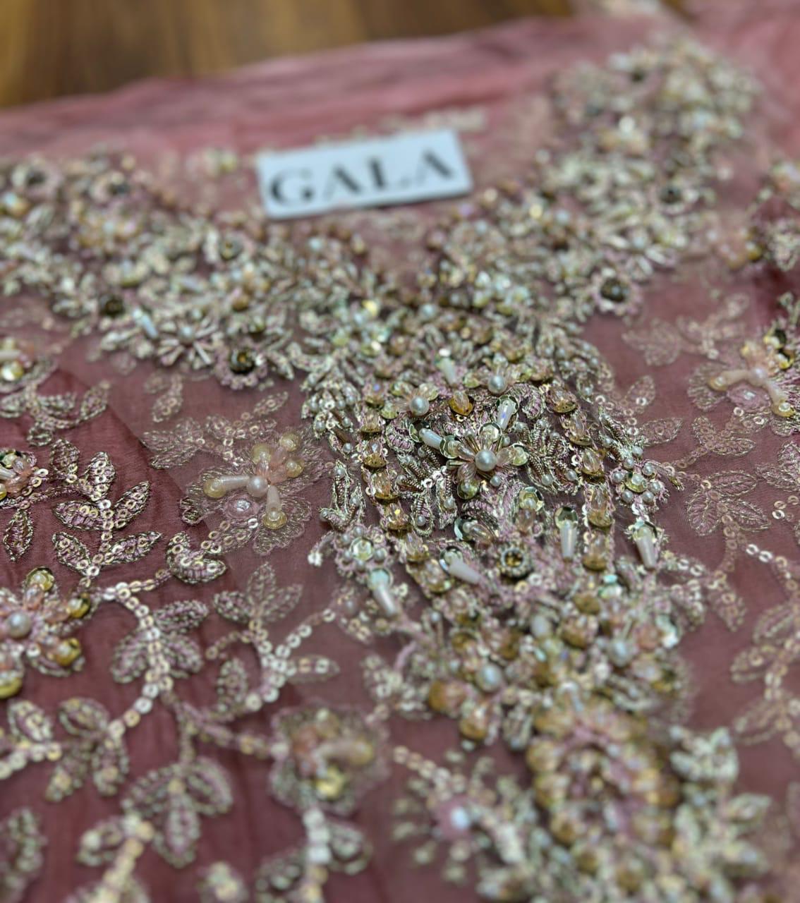 An alluring shade of pink is used as a canvas for a knee length kameez and sharara set. This feminine silhouette is ornamented with pearls, naqshi and dabka. Paired with an embroidered sharara and dupatta, the set is a staple for this season’s traditional affairs.