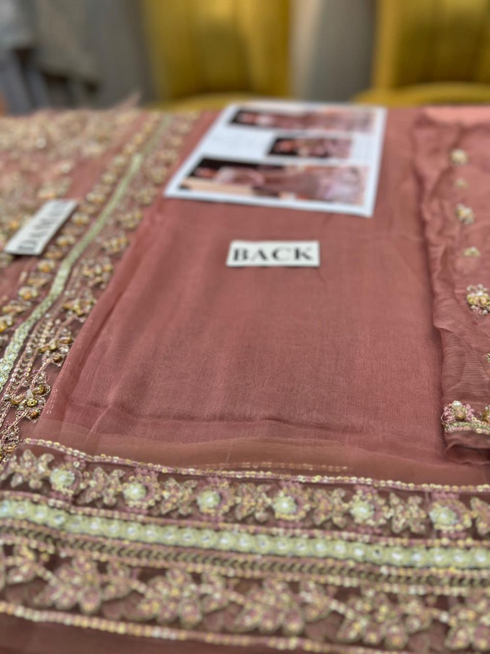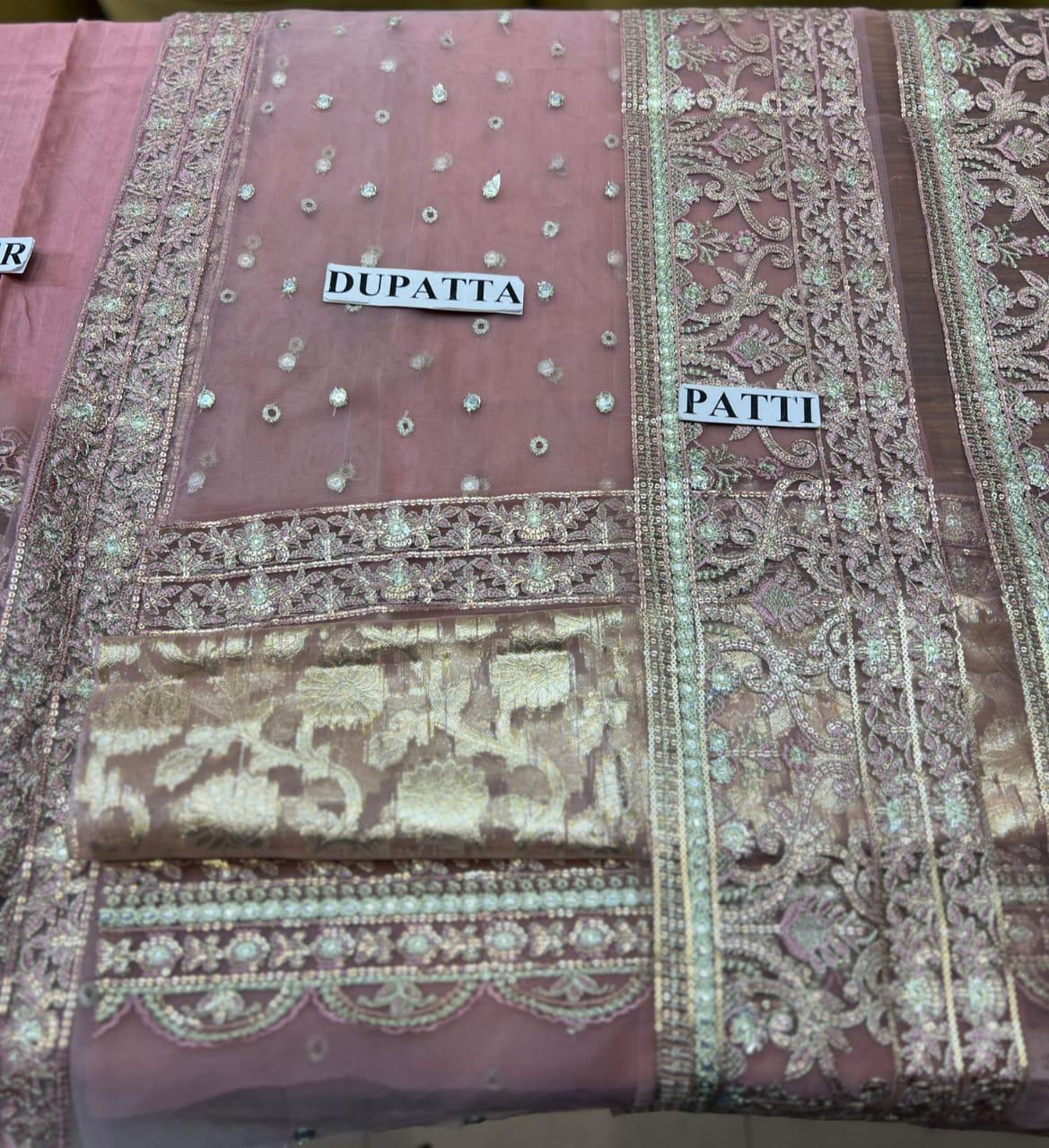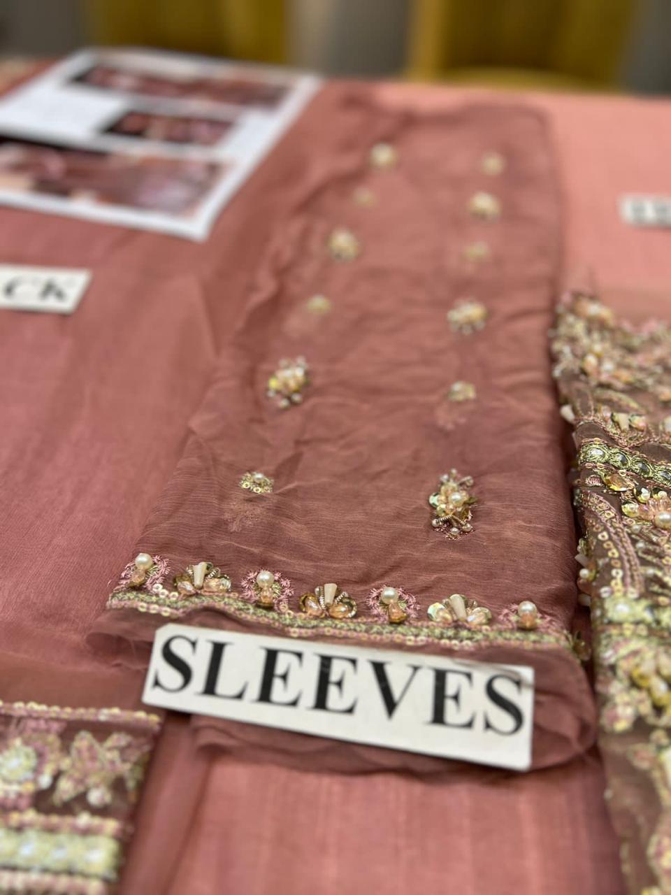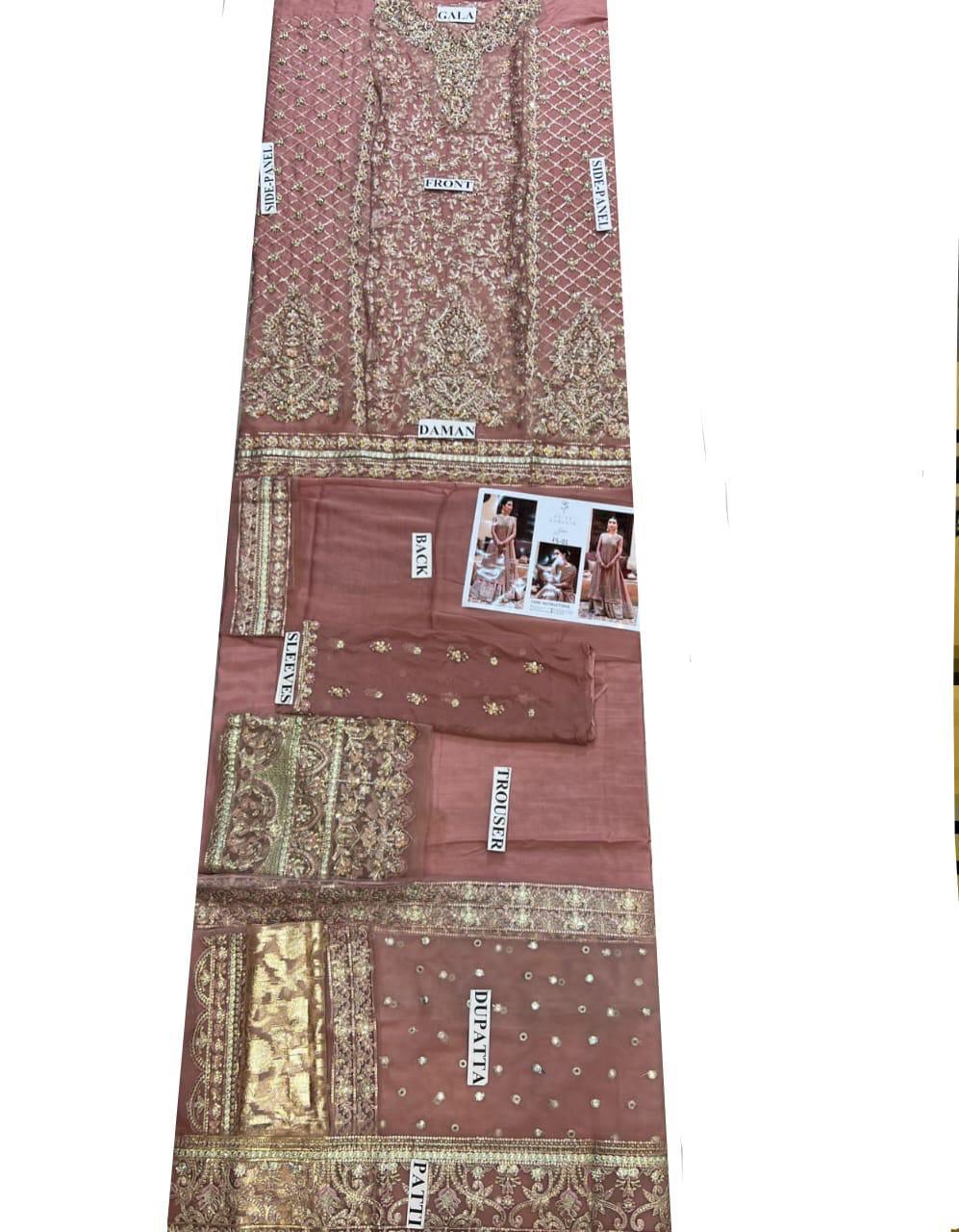 An alluring shade of pink is used as a canvas for a knee length kameez and sharara set. This feminine silhouette is ornamented with pearls, naqshi and dabka. Paired with an embroidered sharara and dupatta, the set is a staple for this season’s traditional affairs.